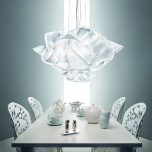 Fabula appears to be a long, silky piece of fabric wound around itself. The new, iridescent versions for ceiling and wall are 60 cm in diameter, handmade with Lentiflex®, and feature 5 light sources that make it perfect for illuminating large spaces. The ceiling, and 48 cm suspension bring a touch of elegance to any space.