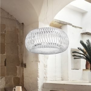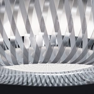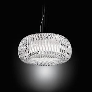 Inspired by the art of weaving, part of humanity from prehistoric times in the form of baskets and cane sacks, Kalatos revisits these archetypes with a modern take using Slamp’s advanced technopolymers; the collection has both suspension and ceiling versions. They come in two colour combinations: matte black with an internal gold finish, or white with transparent Lentiflex®.