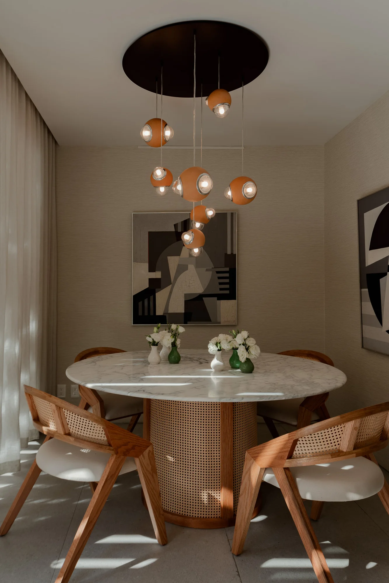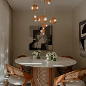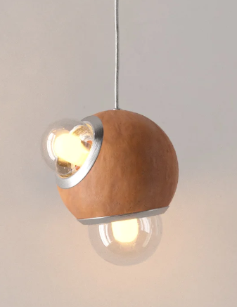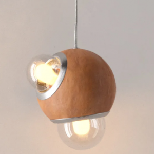 Una lámpara colgante en la cual su cuerpo central está compuesto por una esfera de barro negro fabricado de manera artesanal en Oaxaca. La luminaria está rodeada por diferentes fuentes de luz que sobresalen esparciendo su destello a través de sus difusores de vidrio ahumado cuya dimensión es diferente en relación al tamaño del producto. Un sutil borde de aluminio anodizado en color negro delinea la circunferencia de cada difusor vítreo.