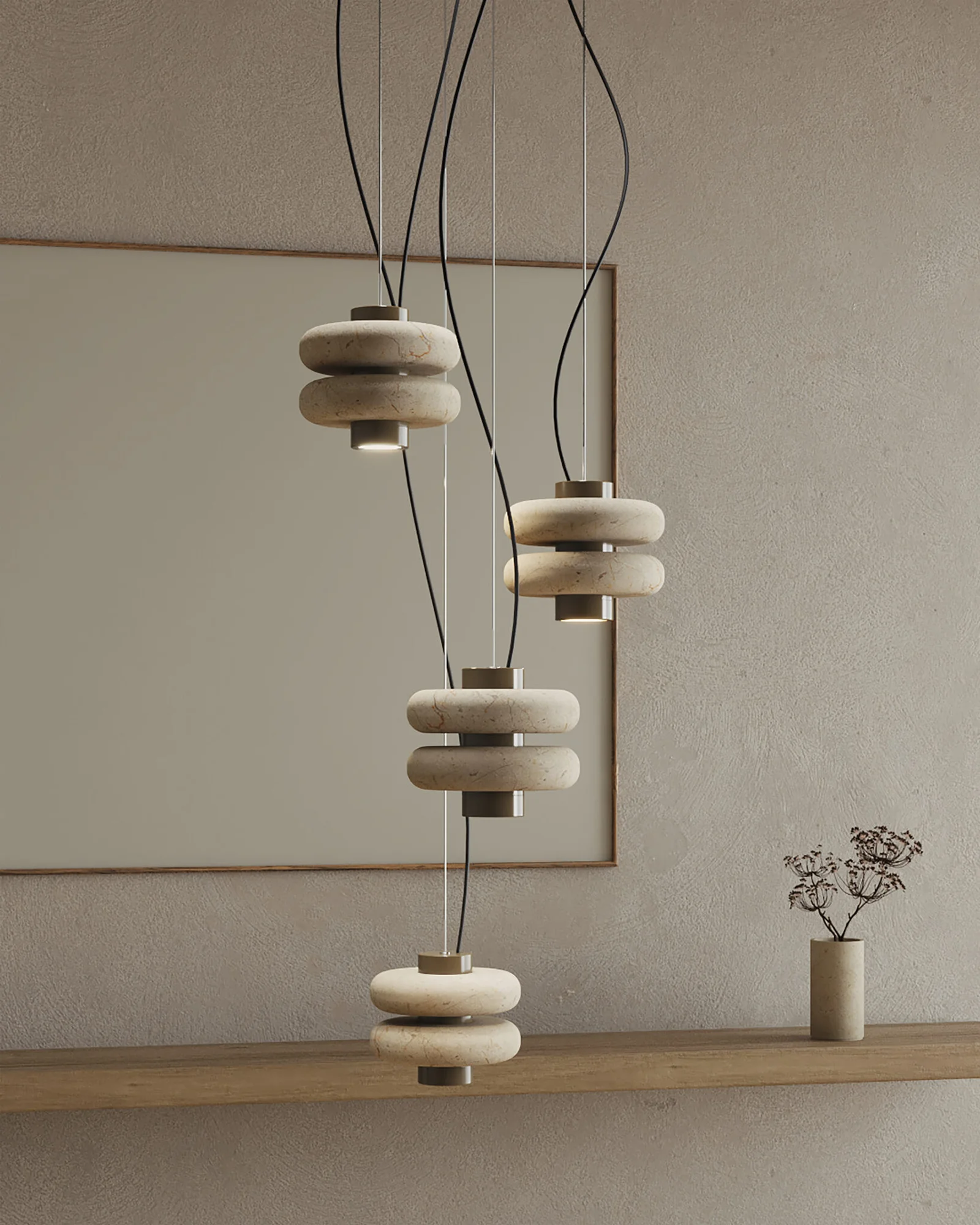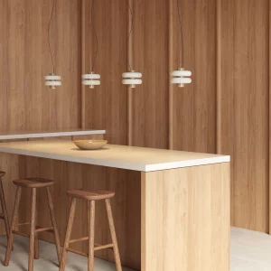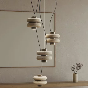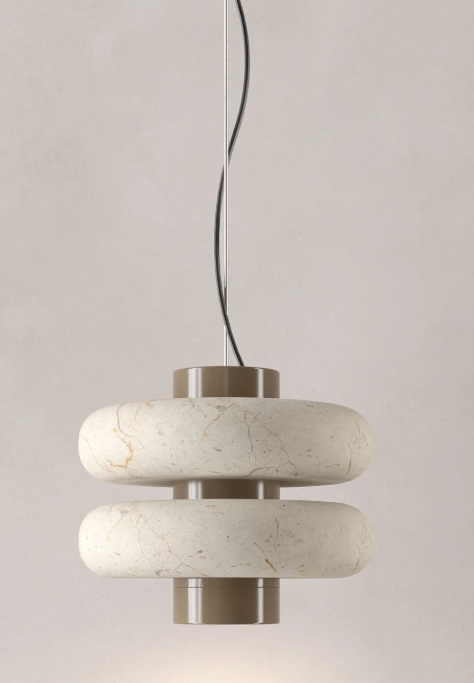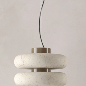 La lámpara colgante DUO suspende a través de un tensor de acero inoxidable un eje central de metal cromado del cuál se proyecta una luz cálida y focalizada, en el convergen un par de aros de mármol verde. Dentro de su diseño se fusiona la solidez del mármol con una forma suave y simétrica.