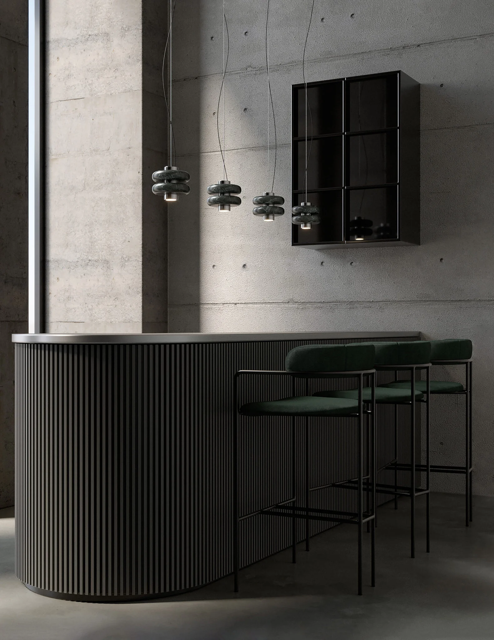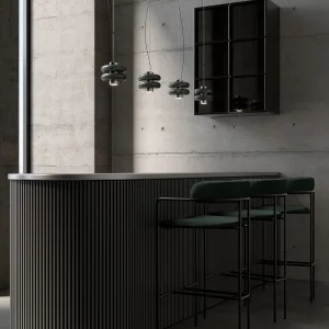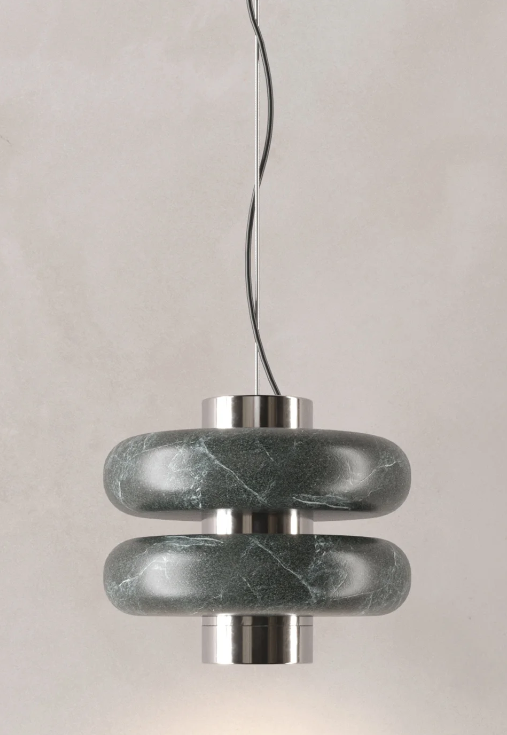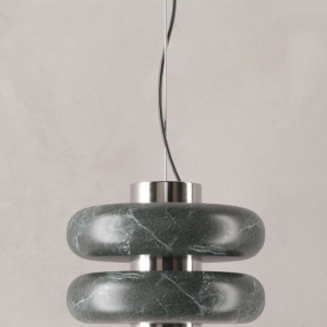 La lámpara colgante DUO suspende a través de un tensor de acero inoxidable un eje central de metal cromado del cuál se proyecta una luz cálida y focalizada, en el convergen un par de aros de mármol verde. Dentro de su diseño se fusiona la solidez del mármol con una forma suave y simétrica.