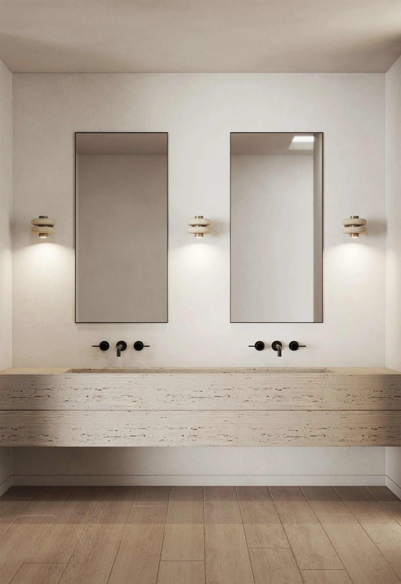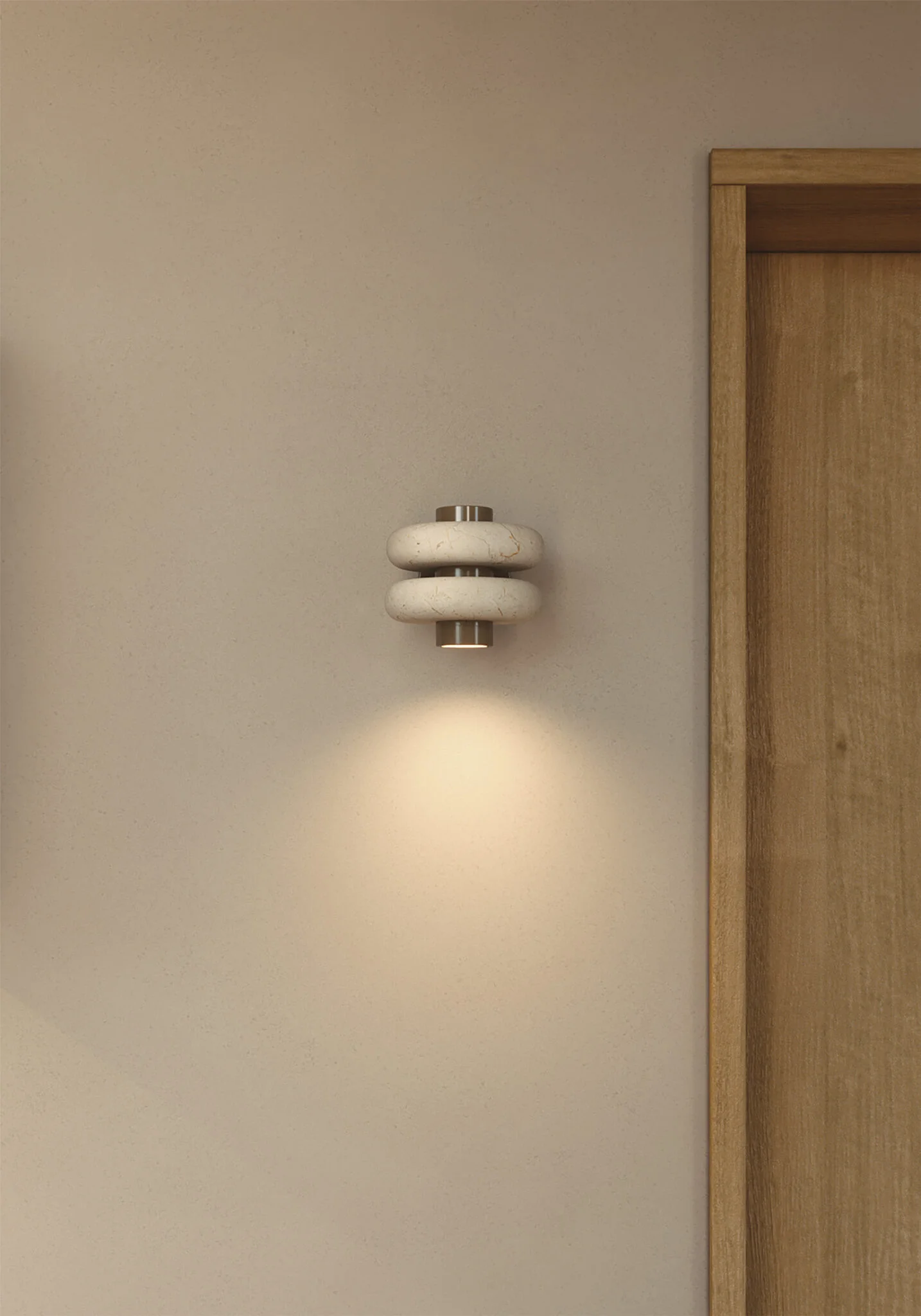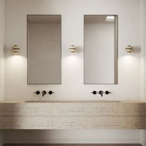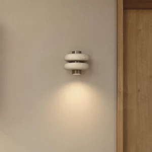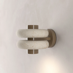 La lámpara arbotante DUO se compone de un eje central de metal con pintura electrostática del cuál se proyecta una luz cálida y focalizada, en el convergen un par de aros de mármol beige. Dentro de su diseño se fusiona la solidez del mármol con una forma suave y simétrica.