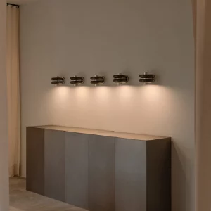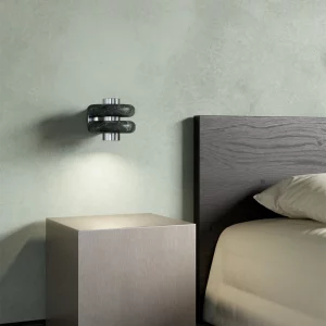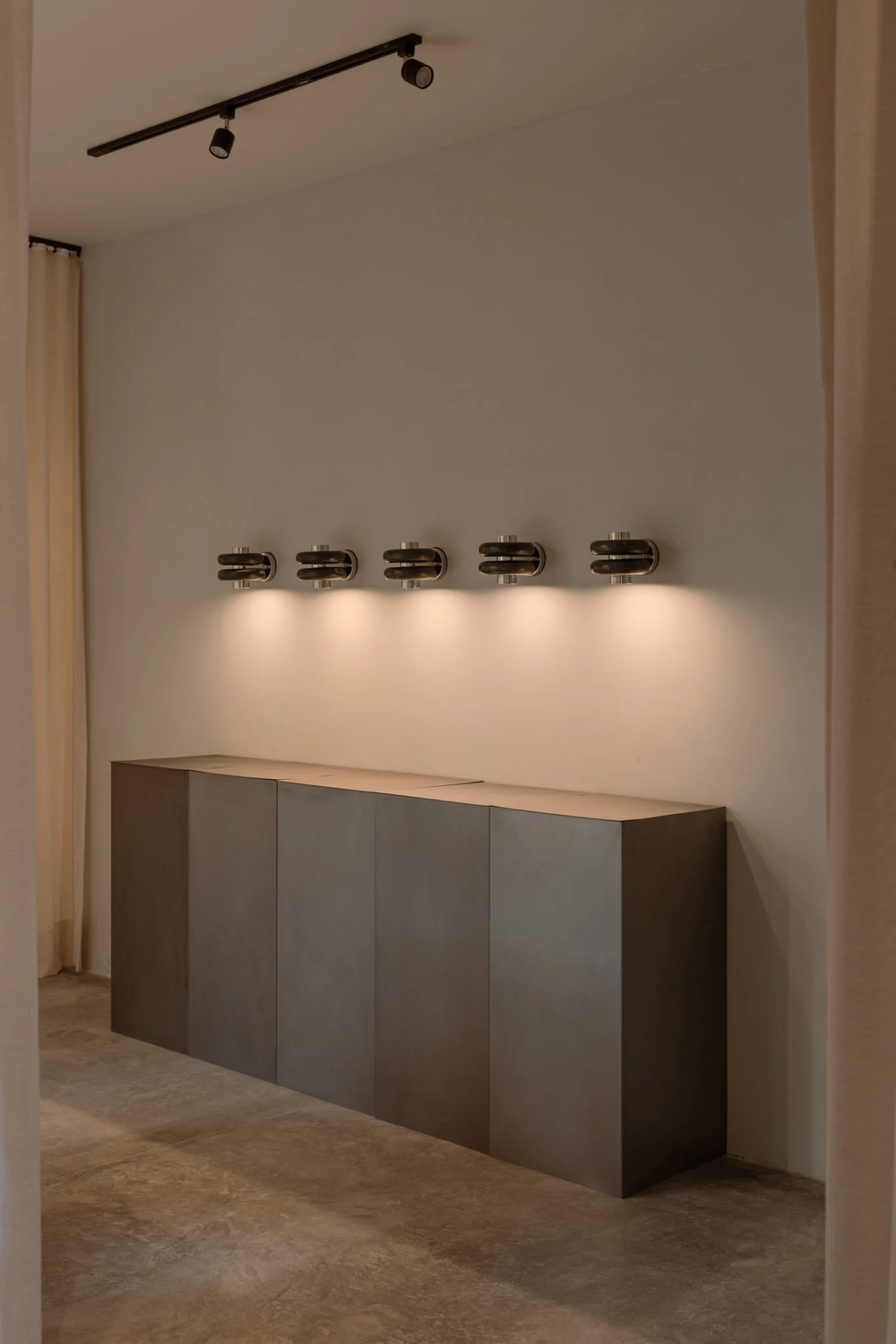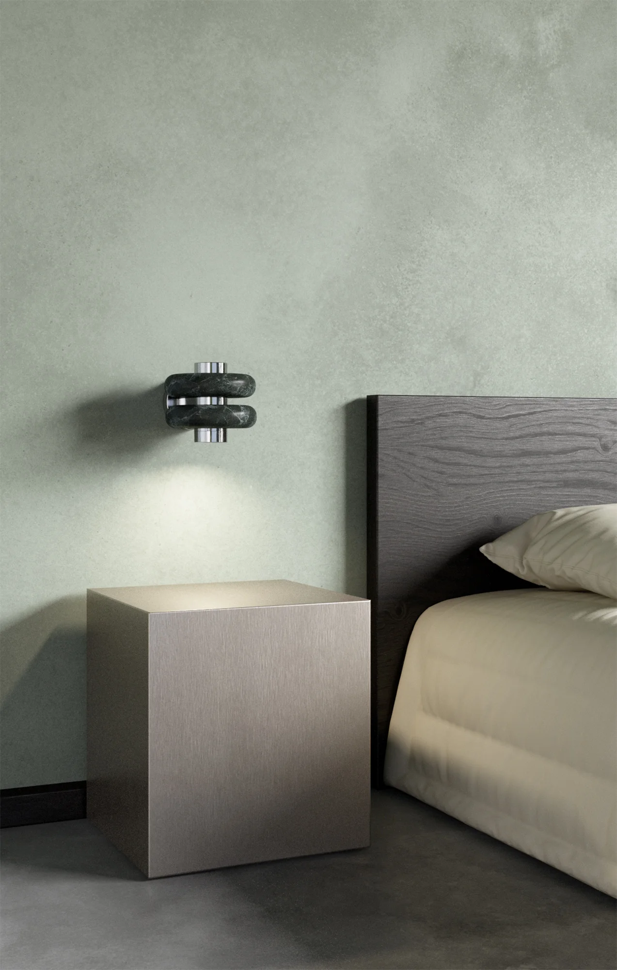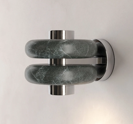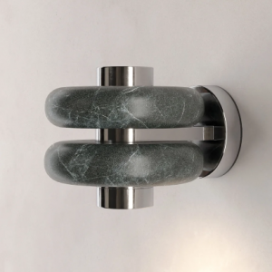 La lámpara arbotante DUO se compone de un eje central de metal cromado del cuál se proyecta una luz cálida y focalizada, en el convergen un par de aros de mármol verde. Dentro de su diseño se fusiona la solidez del mármol con una forma suave y simétrica.