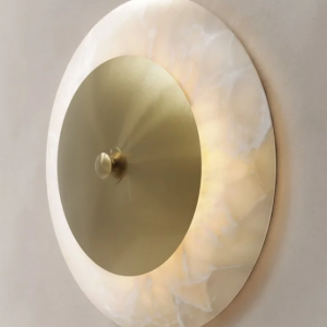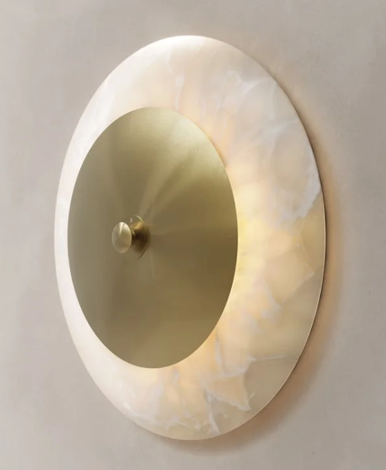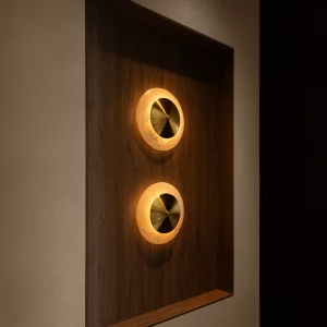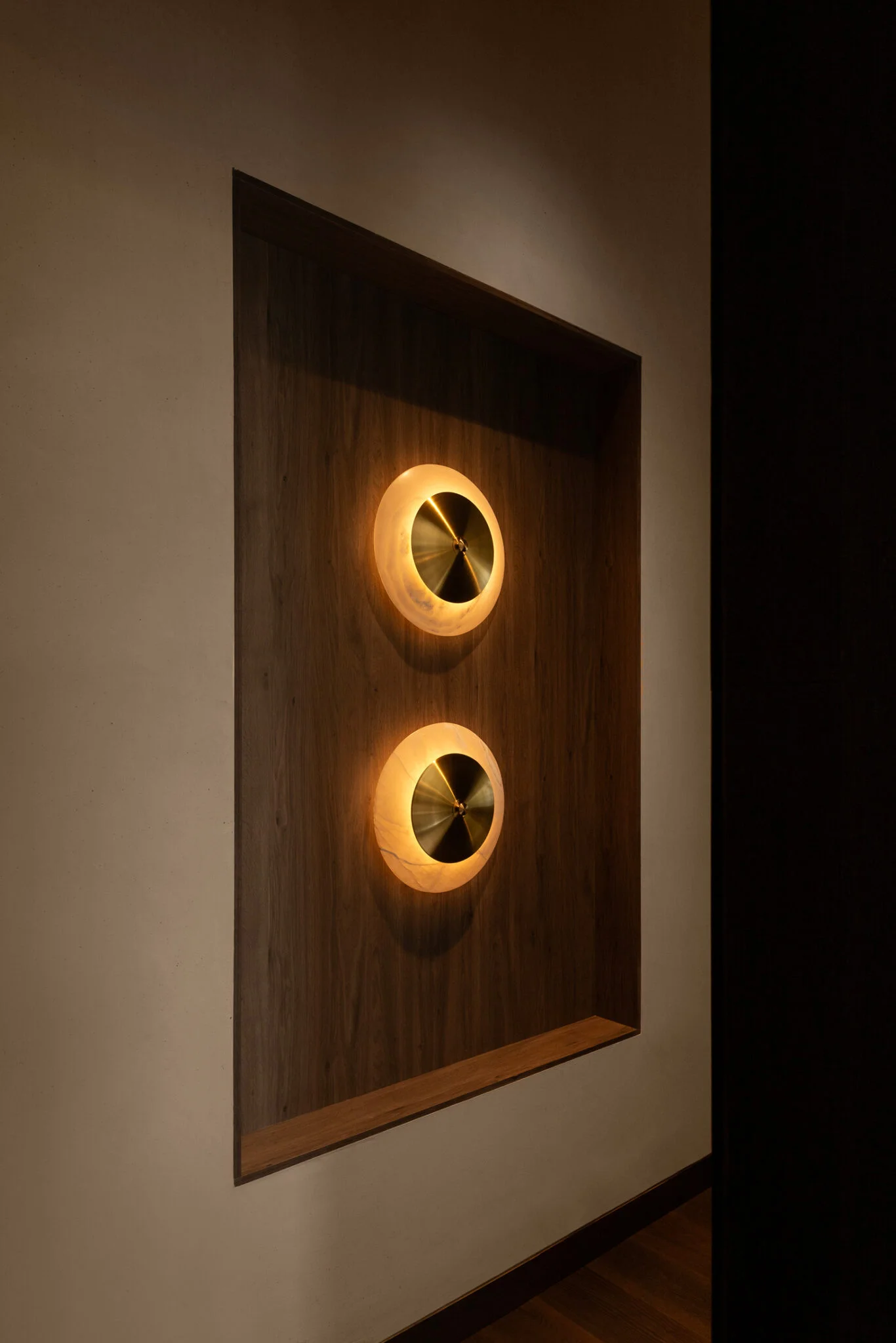 La lámpara arbotante FASE se compone de un plato de ónix que se ilumina completamente por la fuente de luz ubicada en su interior. El disco de latón superior alberga la luz y al mismo tiempo refleja la iluminación proveniente del espacio a través de su geometría parabólica. Esta lámpara de muro vista de manera frontal, se asemeja a la luna llena.