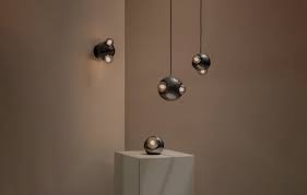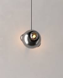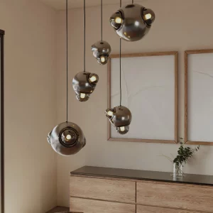 A hanging lighting fixture with a central body composed of a sphere made of handmade black barro from Oaxaca. It is surrounded by various light sources that protrude, dispersing their glow through its smoked glass diffusers. A subtle edge of black anodized aluminum outlines the circumference of each luminaire’s diffuser.