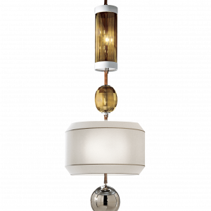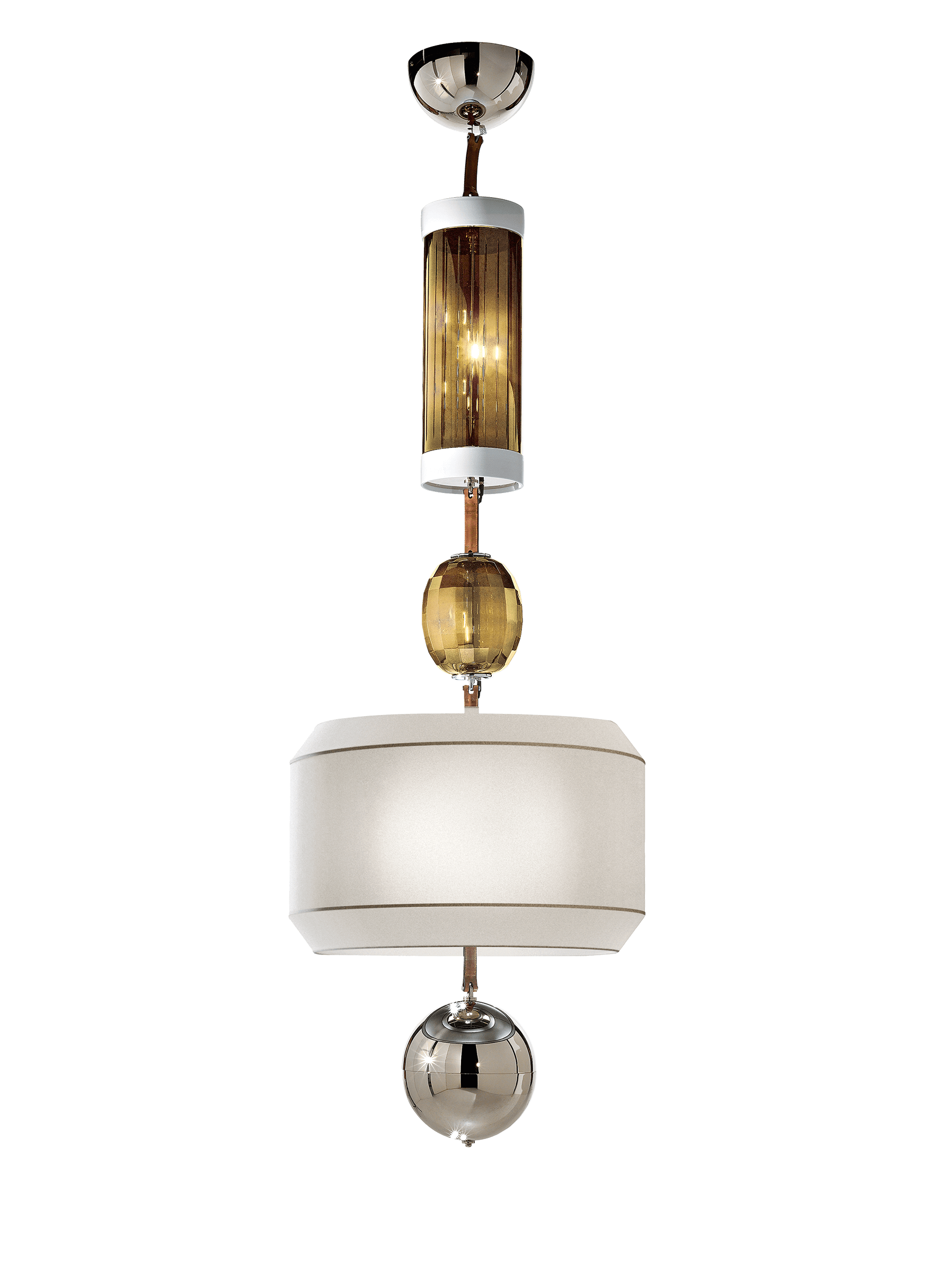 Suspension lamp made of glass, metal, crystal, leather and ceramic elements.