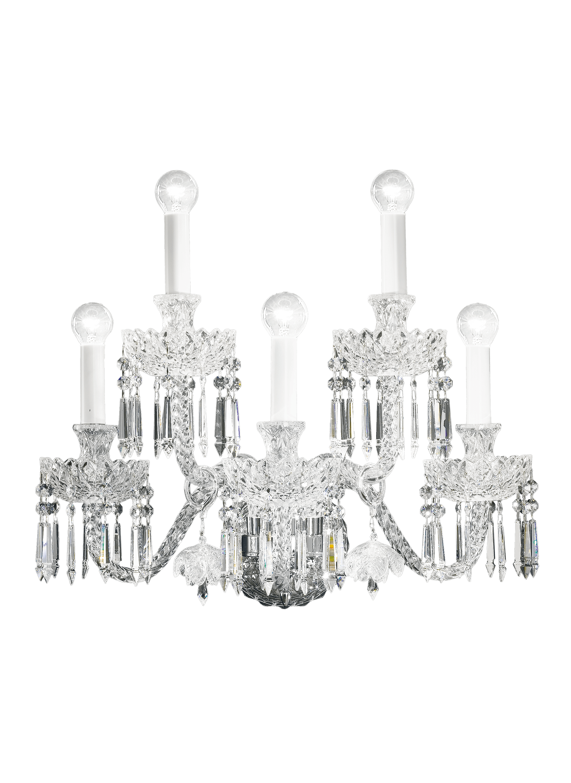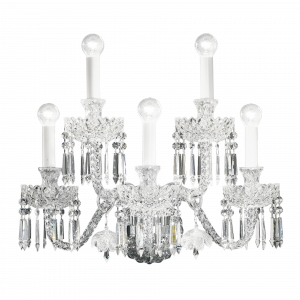 Wall lamp in carved crystal and glass. Metal with gold or iron grey finish, crystal pendants and decorative glass flowers.