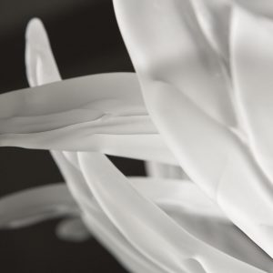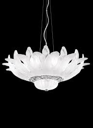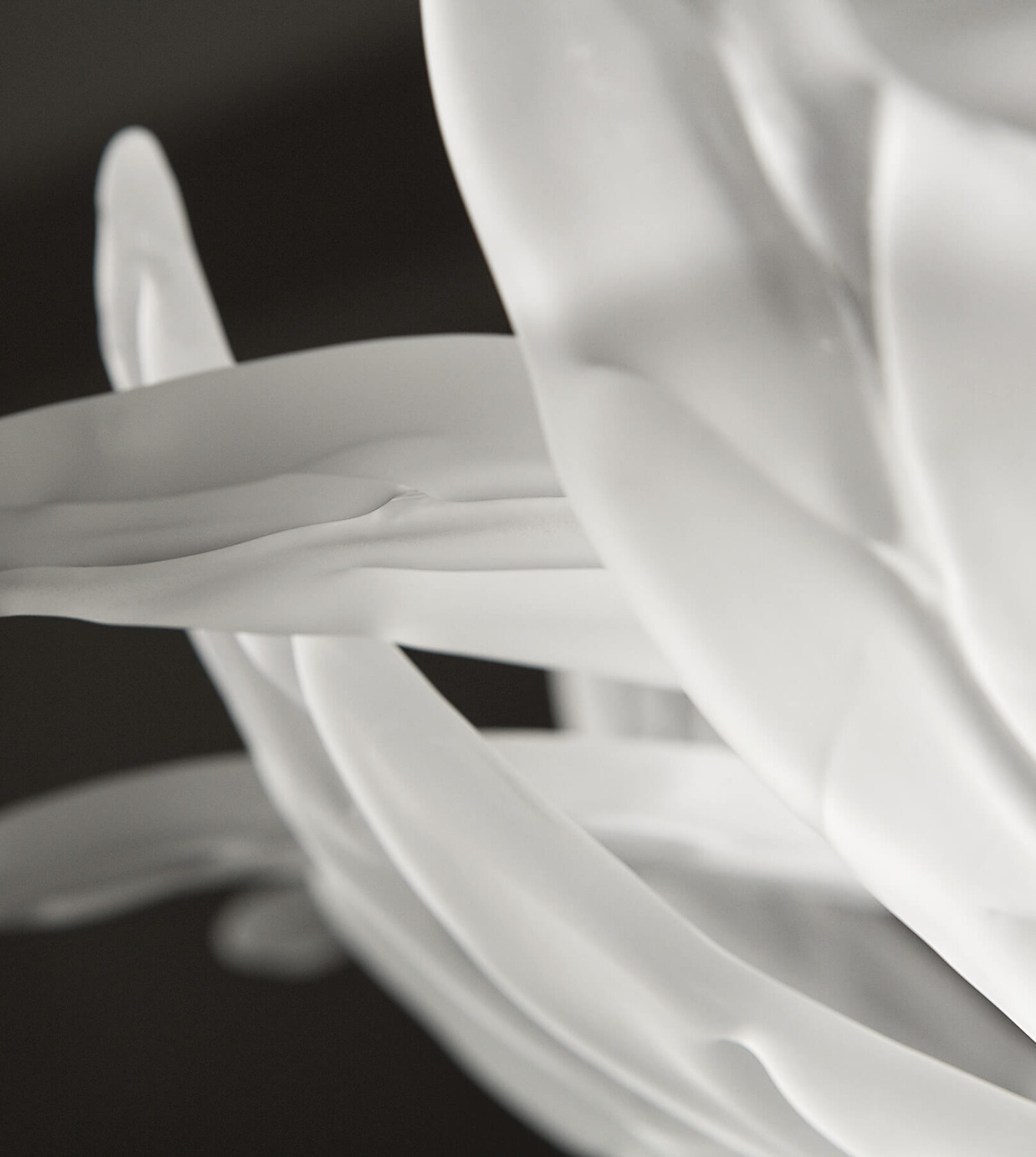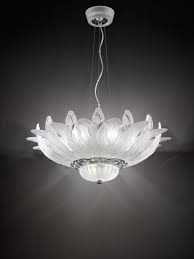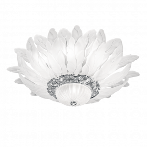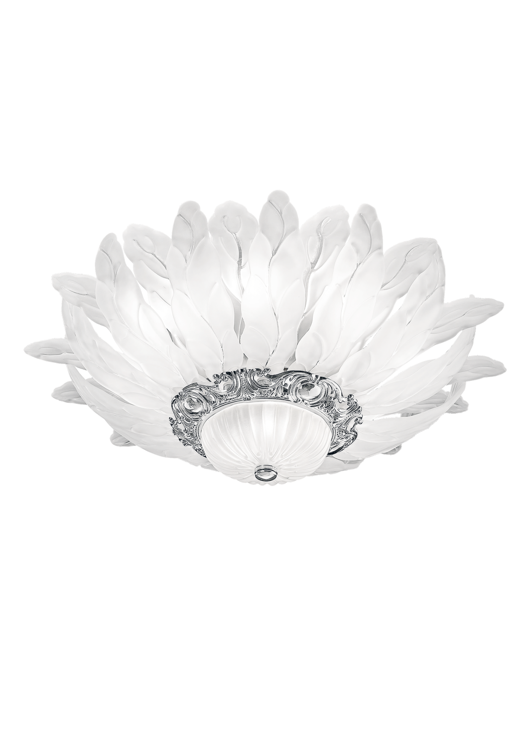 Ceiling lamp with transparent or etched glass leaves and metal decoration with nickel or matte gold finish.