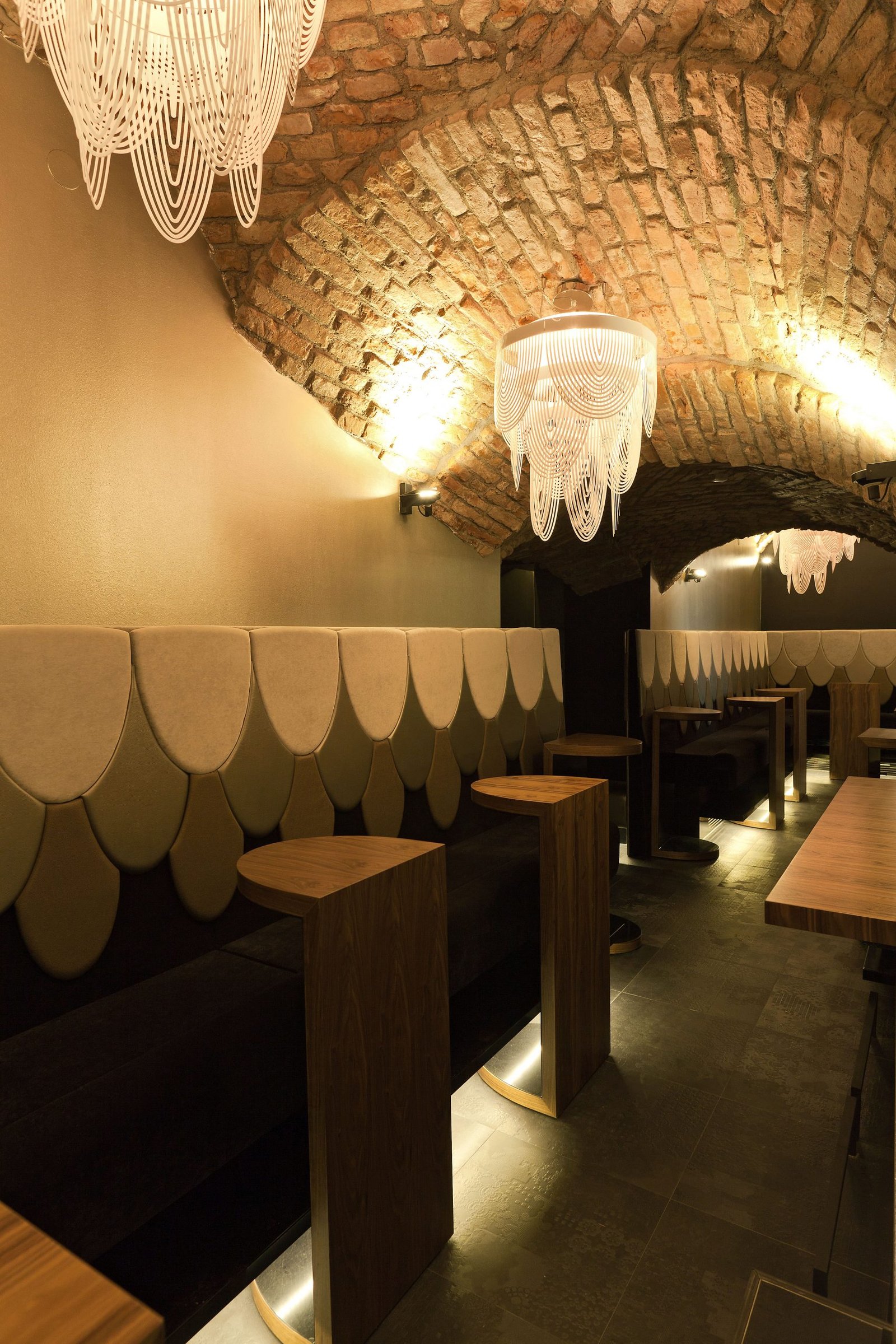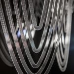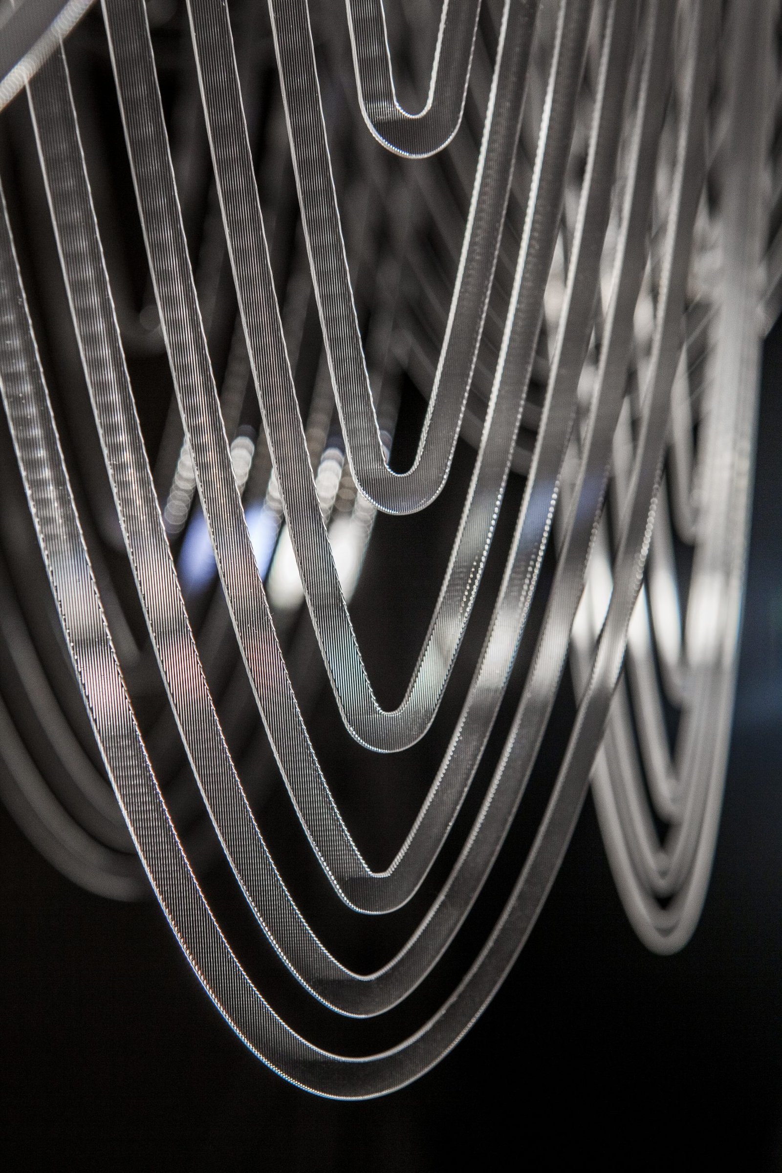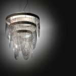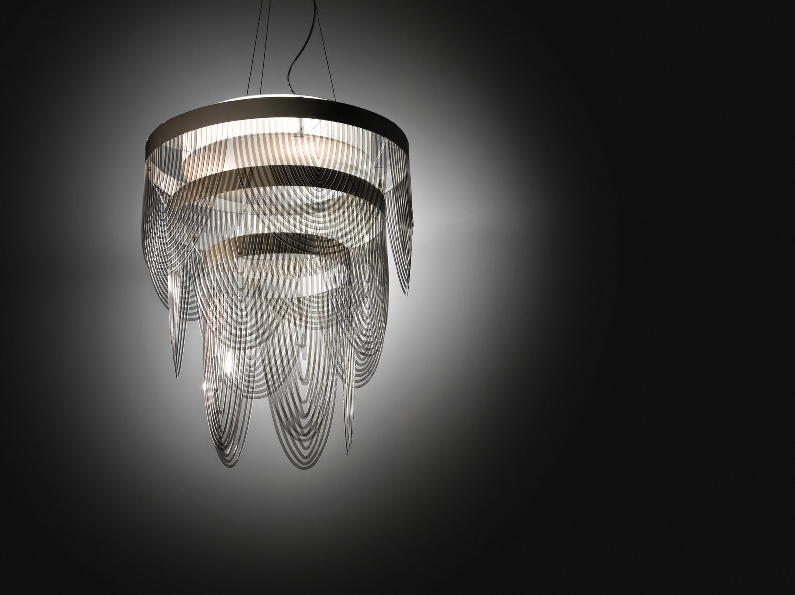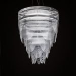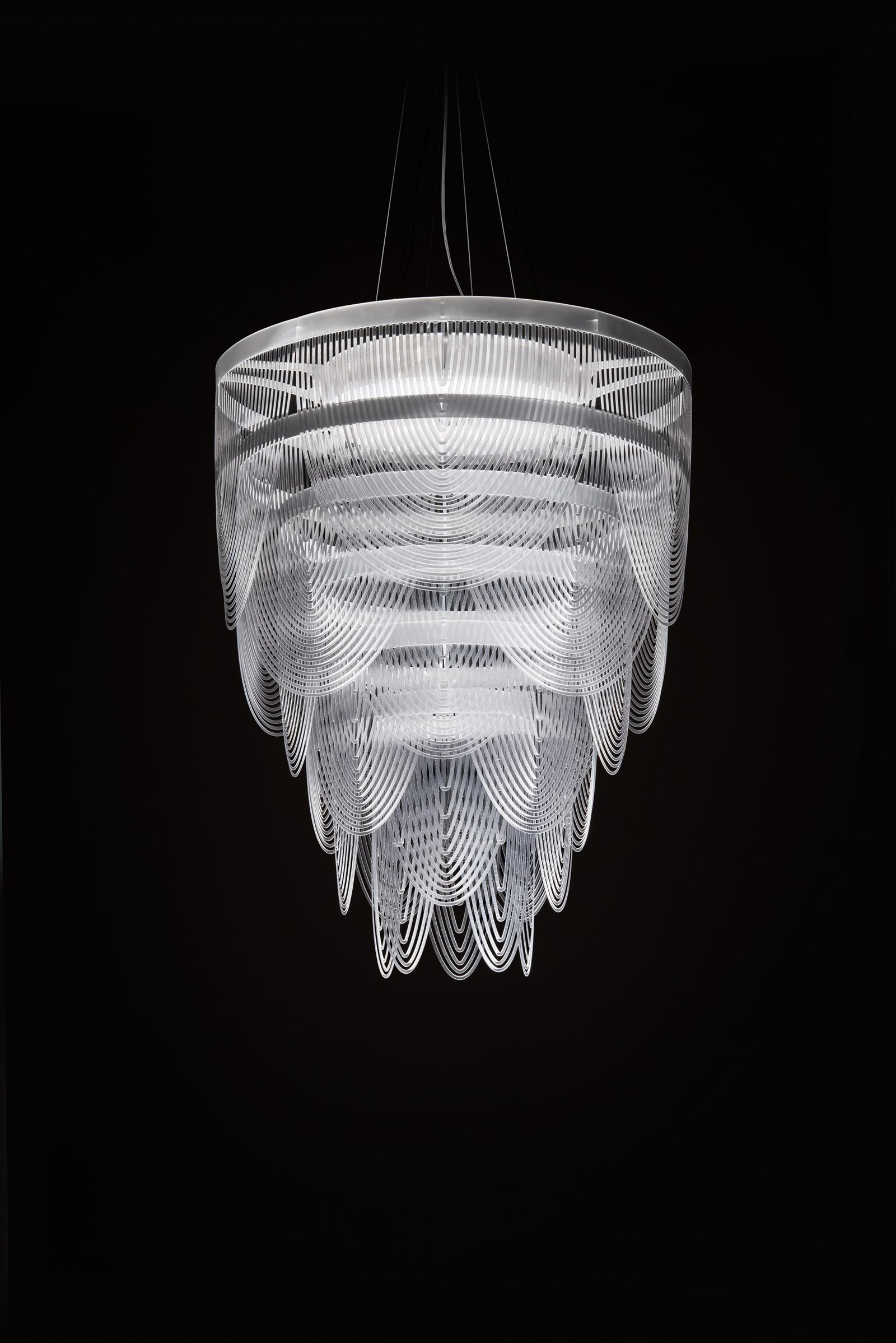 Ceremony is an opulent lamp, an ode to femininity that conjures up the image of the brush of a skirt, a pearl choker, drapery on decoltè. The five light sources are spread over technopolymer “necklaces” that bring an air of drama and intrinsic weightlessness to its powerful presence.