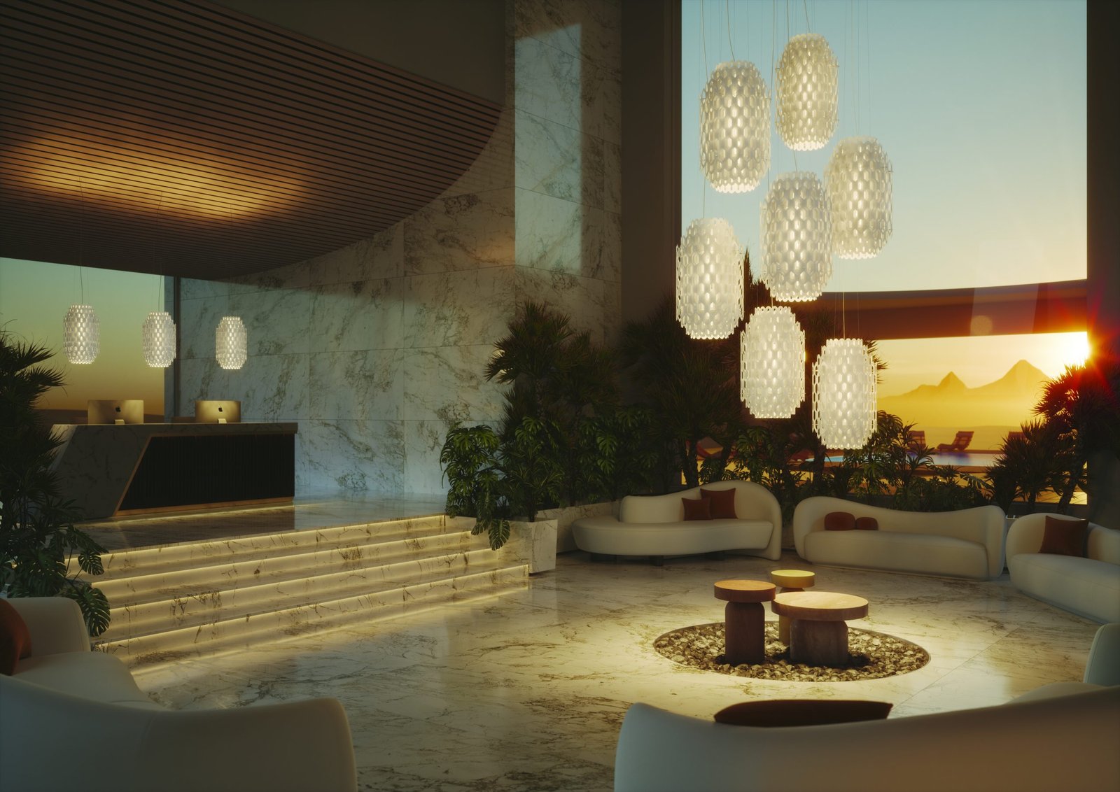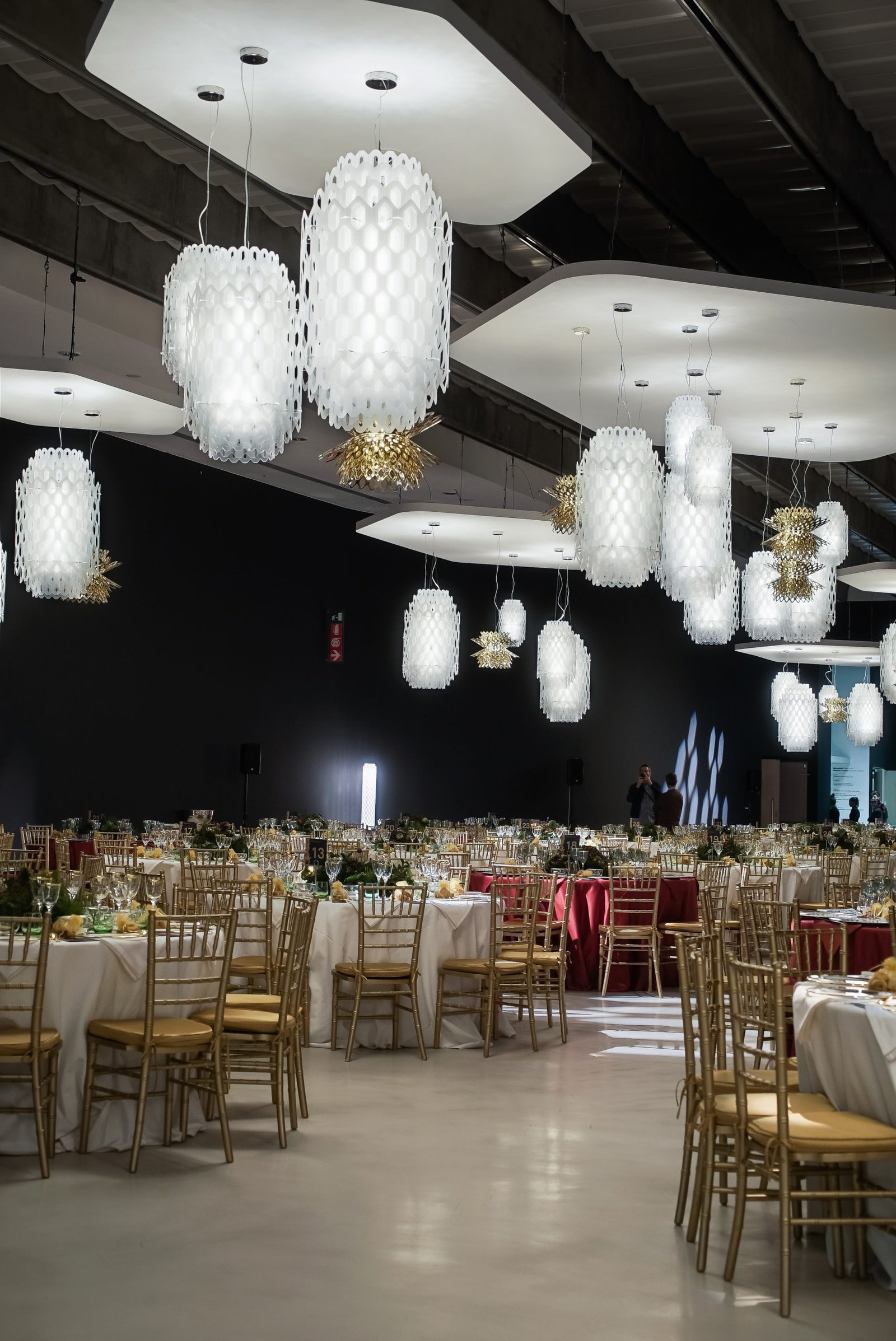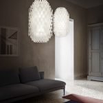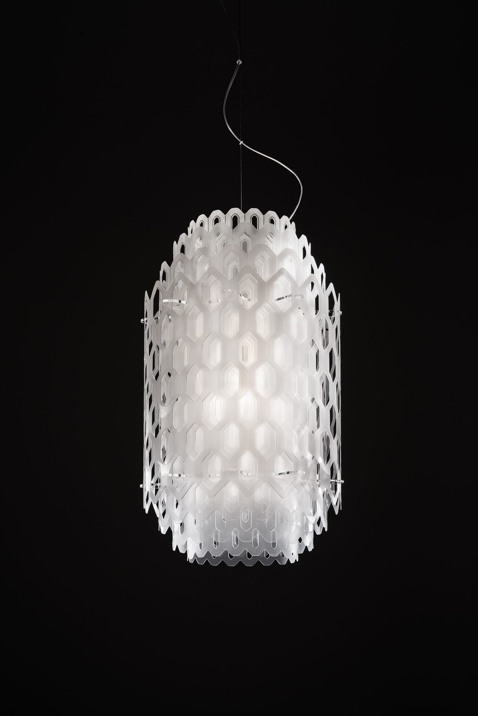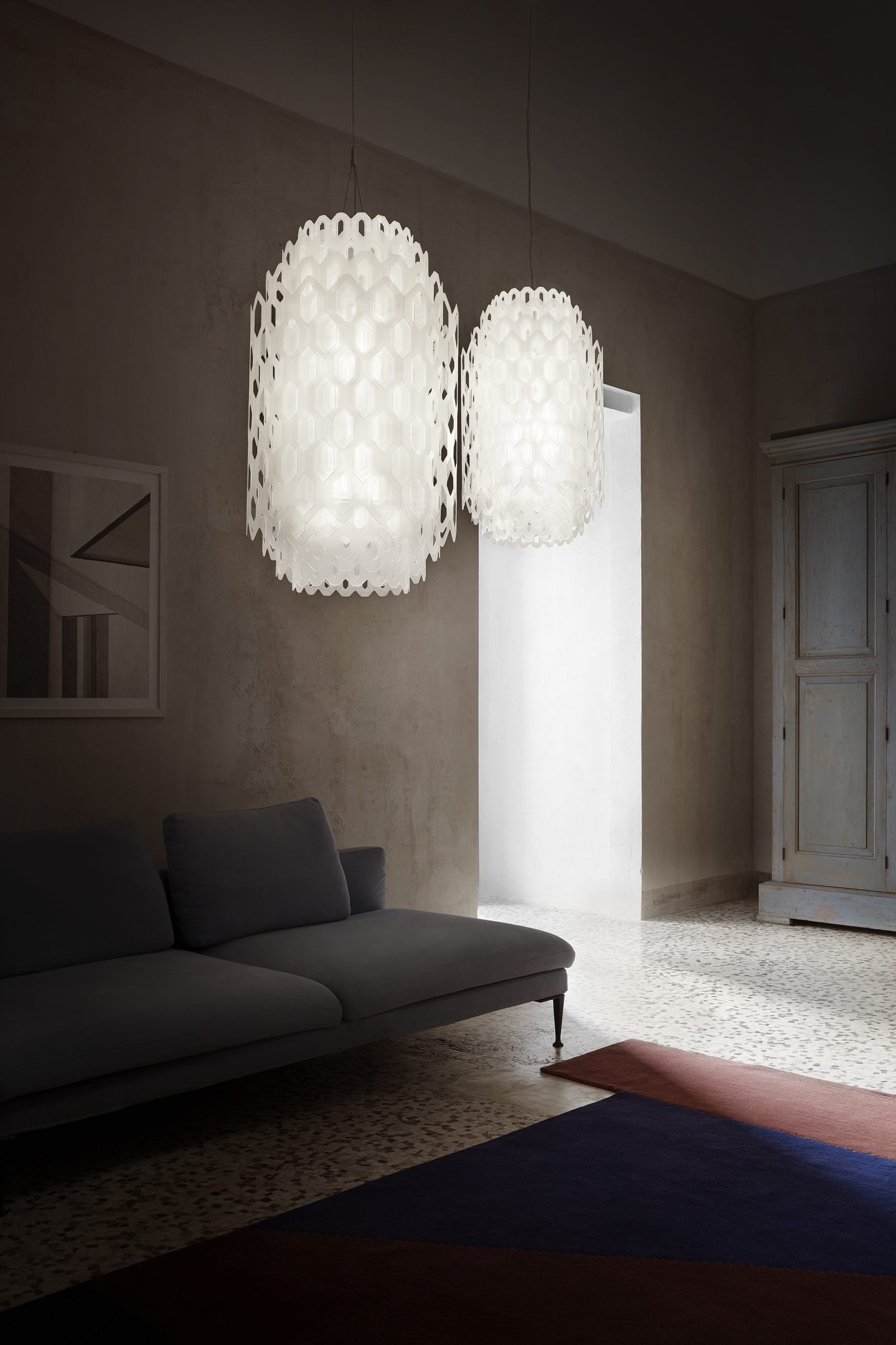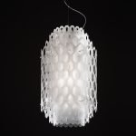 Chantal’s sculptural shape seems to be molded from a singular, industrious frame, much like honeycomb with its impalpable elements. Its concentric, hexagonal shapes allow for unending views. Chatal’s light source resembles waves pulling away from the shore, leaving little illuminated drops behind. The magnetic attachment allows the product to be easily maintained and cleaned. Chantal suspension is available in 2 different sizes.