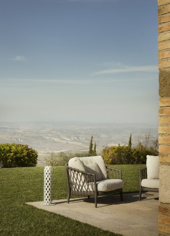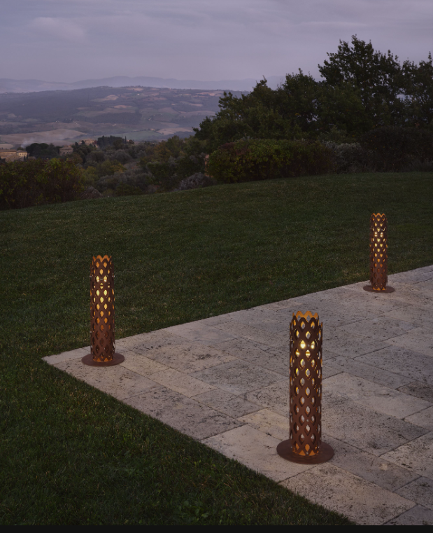 A laborious honeycomb pattern characterizes the design of Charlotte, the iconic collection signed by Doriana and Massimiliano Fusksas for Slamp ready to offer hypnotic and ever-changing perspectives even in its outdoor version, thanks to its surface with perforated hexagonal shapes.