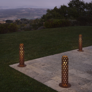 A laborious honeycomb pattern characterizes the design of Charlotte, the iconic collection signed by Doriana and Massimiliano Fusksas for Slamp ready to offer hypnotic and ever-changing perspectives even in its outdoor version, thanks to its surface with perforated hexagonal shapes.