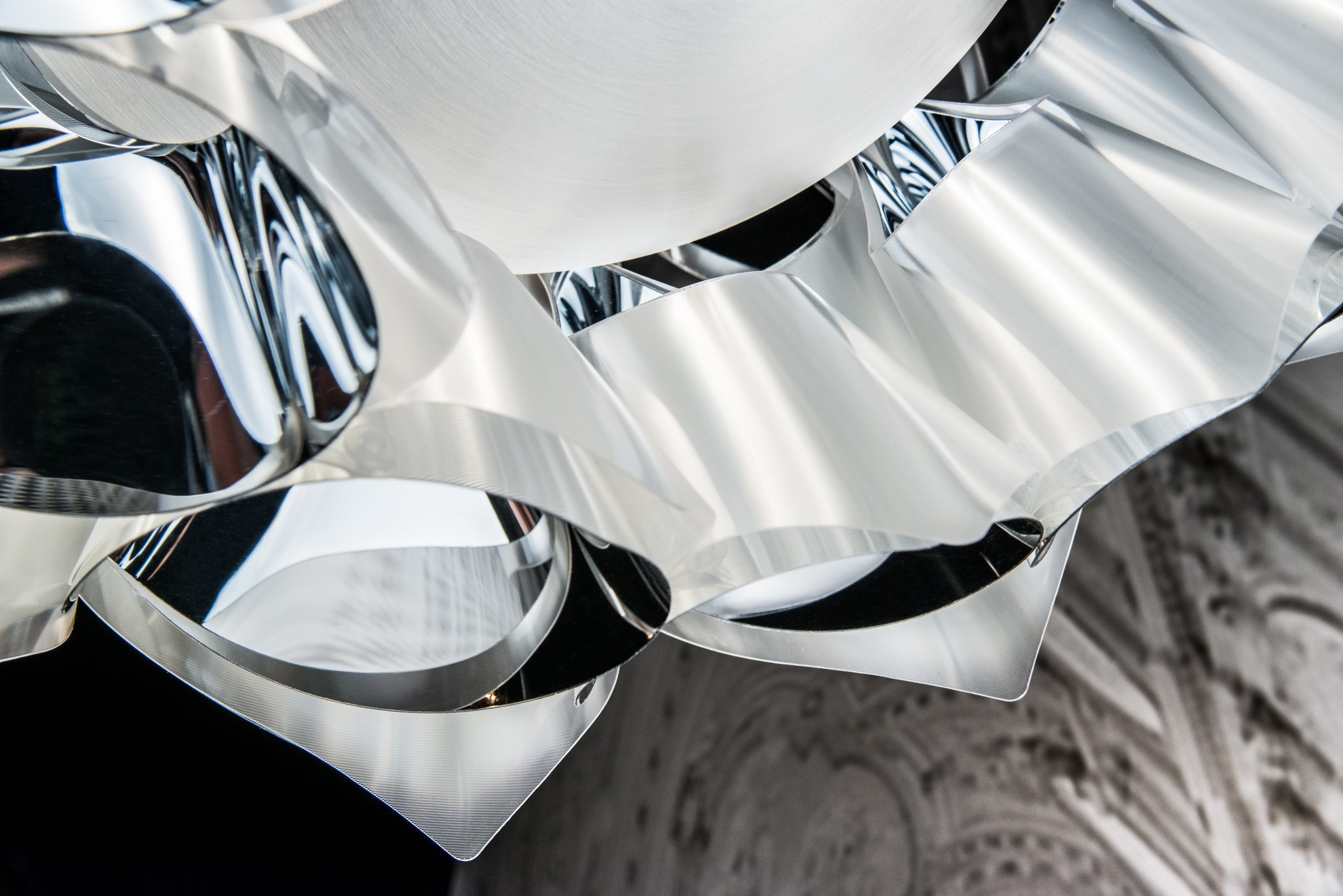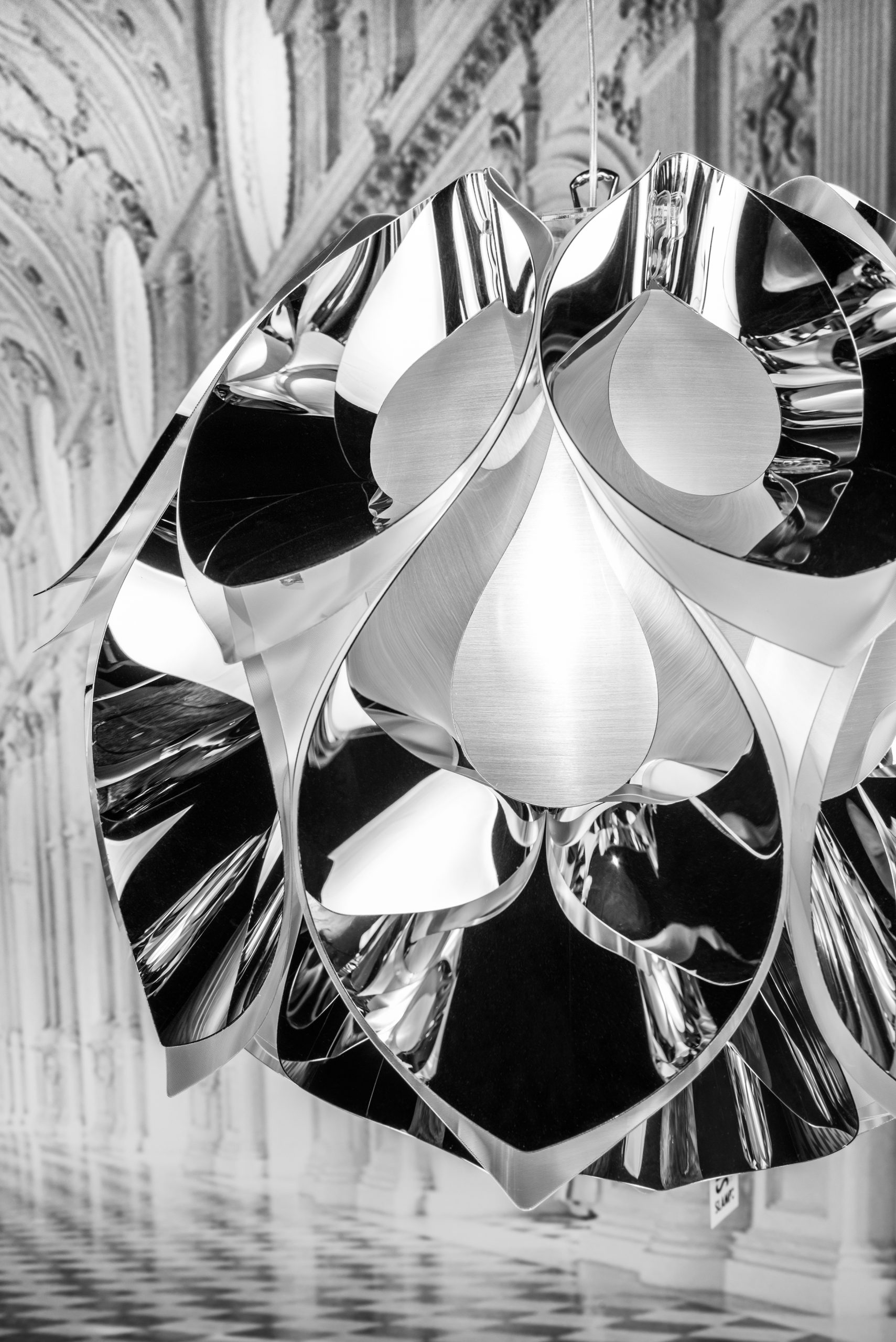 In a land kissed by the sun, nature, colours and artisan expertise bring life to highly expressive pieces dense with archetypes, including Flora, the collection inspired by the Monstera Deliciosa plant. Sixty petals surround a satin sphere illuminated from its core. The lamp is available both as a suspension version, as well as a ground version resting on thin legs that resemble a flower’s pistils. The petals’ shiny finish, to which we have added gun-metal grey, is achieved through an innovative aluminum vapourization system that creates an evocative play on light, seemingly stolen from the sun at its zenith.