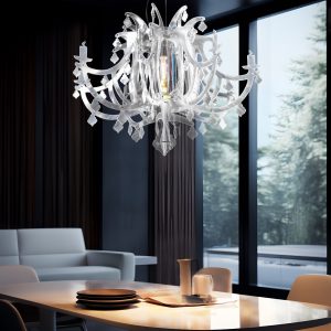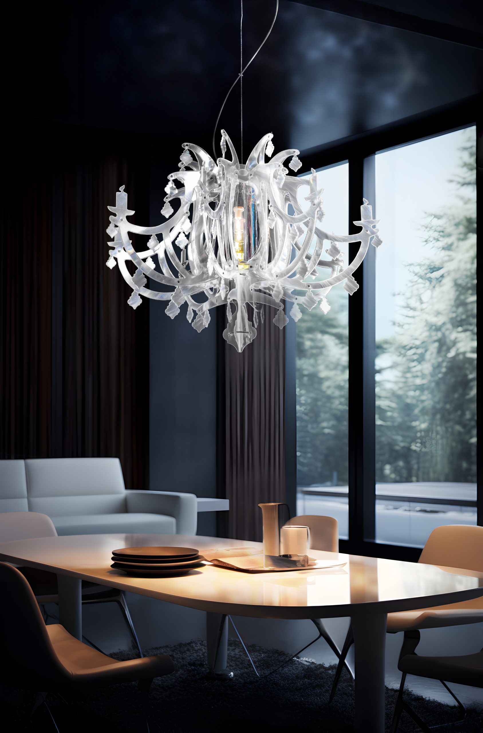 A classic 8-arm chandelier underwent digital evolution; Ginetta’s sumptuous modern shape extends from a central light source that casts elegant, refined reflections, blending into both modern and aristocratic atmospheres. The cylindric diffusor in iridescent polycarbonate is surrounded by the option of three finishes; metal, prisma or Opalflex®.