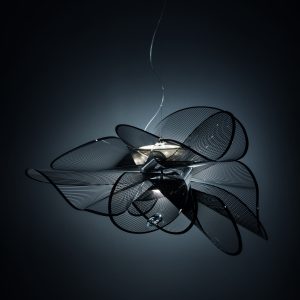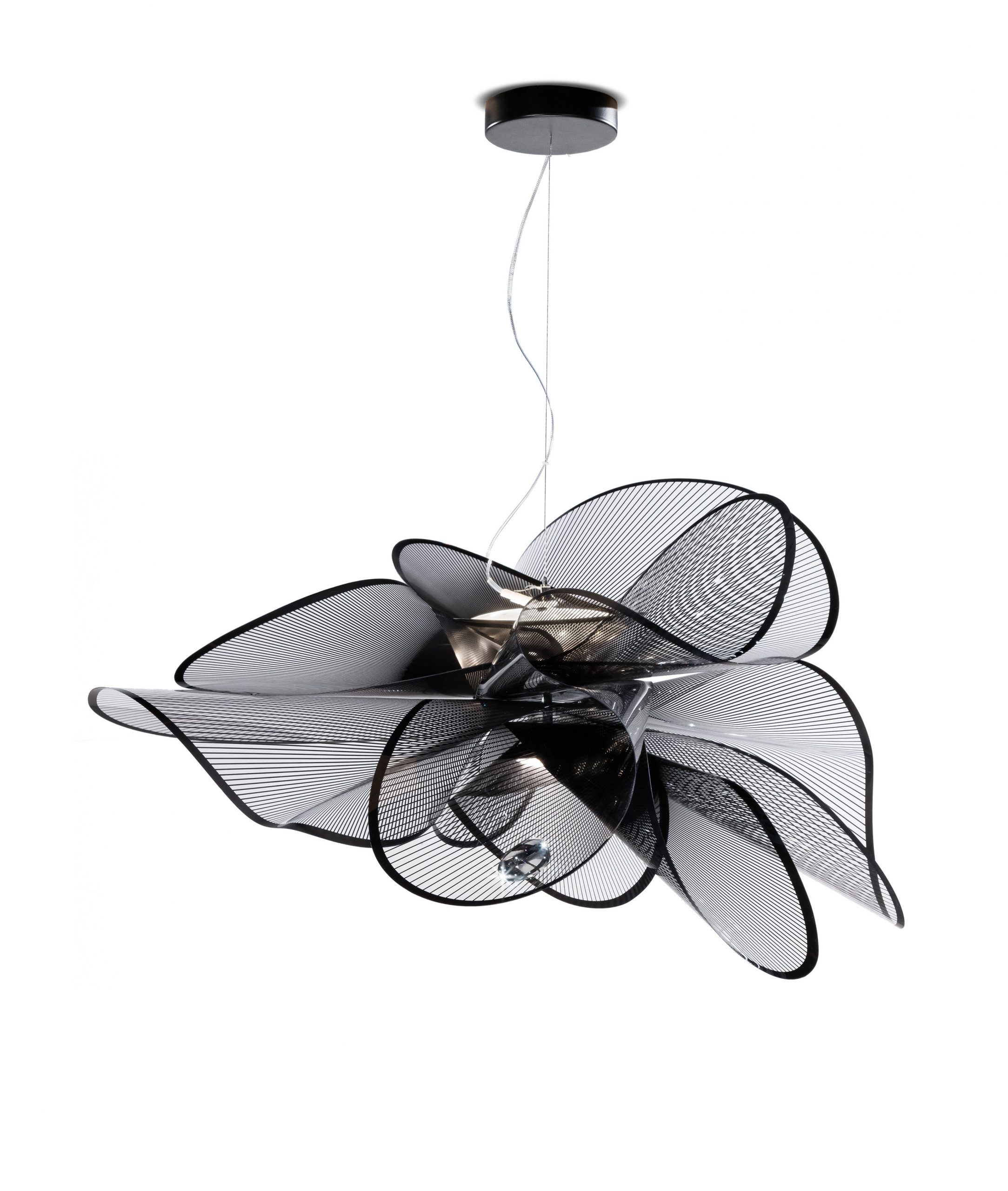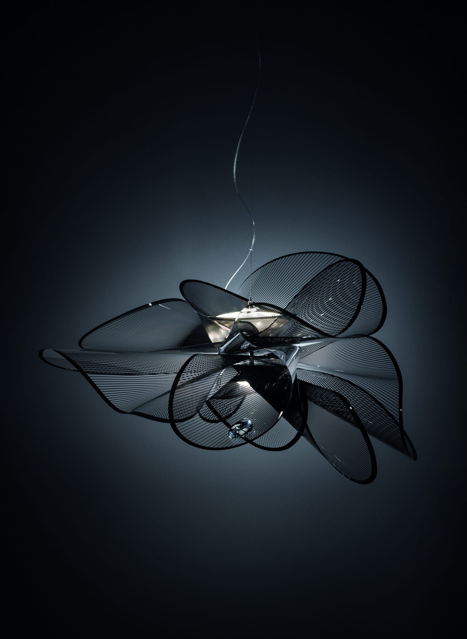 Elegant and sensual movement are part of La Belle Étoile’s visual grammar; the suspension is inspired by the graceful twirling of a ballerina. The lightweight yet unbreakable lamp is completely handcrafted in Slamp’s atelier. The dialogue between technological innovation and stylistic originality speaks loudly; the LED source can be easily and quickly changed thanks to the exclusive magnetic hanging system, and a white texture printed on transparent polymers, are elements that combine to create refined, contemporary design. This modern lamp is comes in two suspension sizes and a ceiling/applique version, available in black or white depending on the type of space. Both versions are versatile, avantgarde lighting solutions offering minimal, glamorous aesthetics. La Belle Étoile brings sculptural illumination to an array of interiors, with lighting intensity varying from 0 to 100 to fit the tastes of those who chose it.