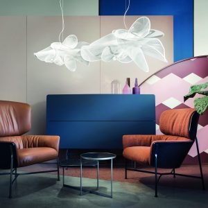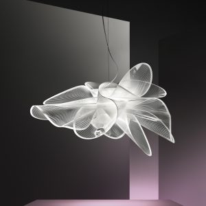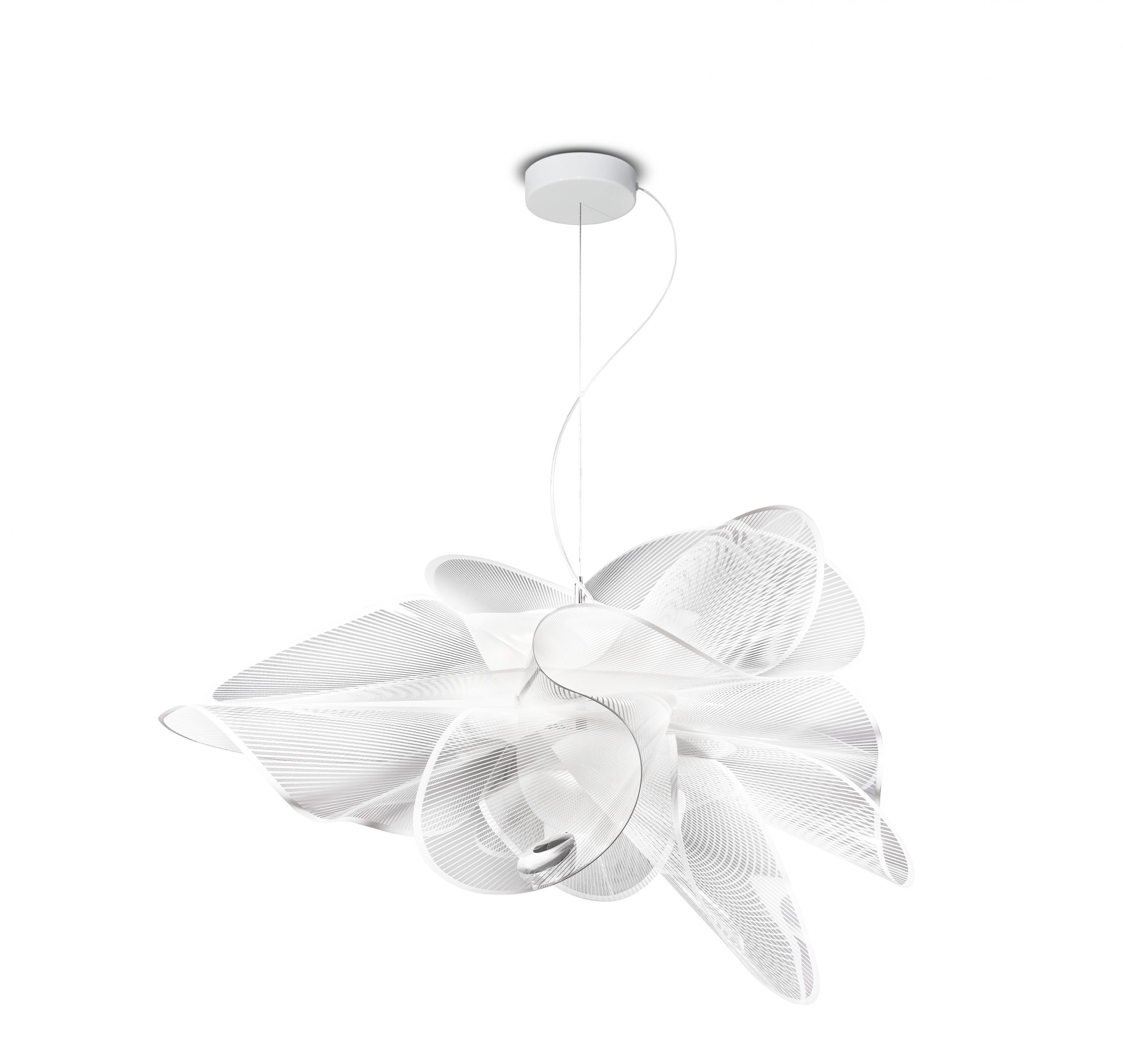 Elegant and sensual movement are part of La Belle Étoile’s visual grammar; the suspension is inspired by the graceful twirling of a ballerina. The lightweight yet unbreakable lamp is completely handcrafted in Slamp’s atelier. The dialogue between technological innovation and stylistic originality speaks loudly; the LED source can be easily and quickly changed thanks to the exclusive magnetic hanging system, and a white texture printed on transparent polymers, are elements that combine to create refined, contemporary design. This modern lamp is comes in two suspension sizes and a ceiling/applique version, available in black or white depending on the type of space. Both versions are versatile, avantgarde lighting solutions offering minimal, glamorous aesthetics. La Belle Étoile brings sculptural illumination to an array of interiors, with lighting intensity varying from 0 to 100 to fit the tastes of those who chose it.