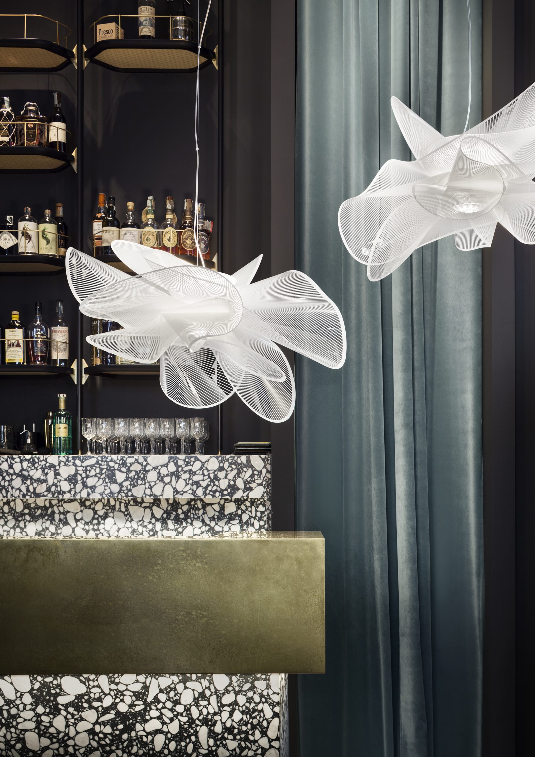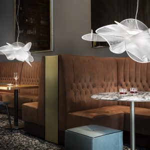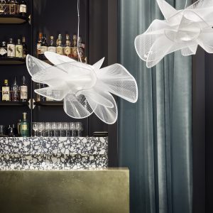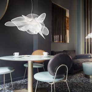 Elegant and sensual movement are part of La Belle Étoile’s visual grammar; the suspension is inspired by the graceful twirling of a ballerina. The lightweight yet unbreakable lamp is completely handcrafted in Slamp’s atelier. The dialogue between technological innovation and stylistic originality speaks loudly; the LED source can be easily and quickly changed thanks to the exclusive magnetic hanging system, and a white texture printed on transparent polymers, are elements that combine to create refined, contemporary design. This modern lamp is comes in two suspension sizes and a ceiling/applique version, available in black or white depending on the type of space. Both versions are versatile, avantgarde lighting solutions offering minimal, glamorous aesthetics. La Belle Étoile brings sculptural illumination to an array of interiors, with lighting intensity varying from 0 to 100 to fit the tastes of those who chose it.