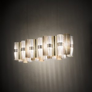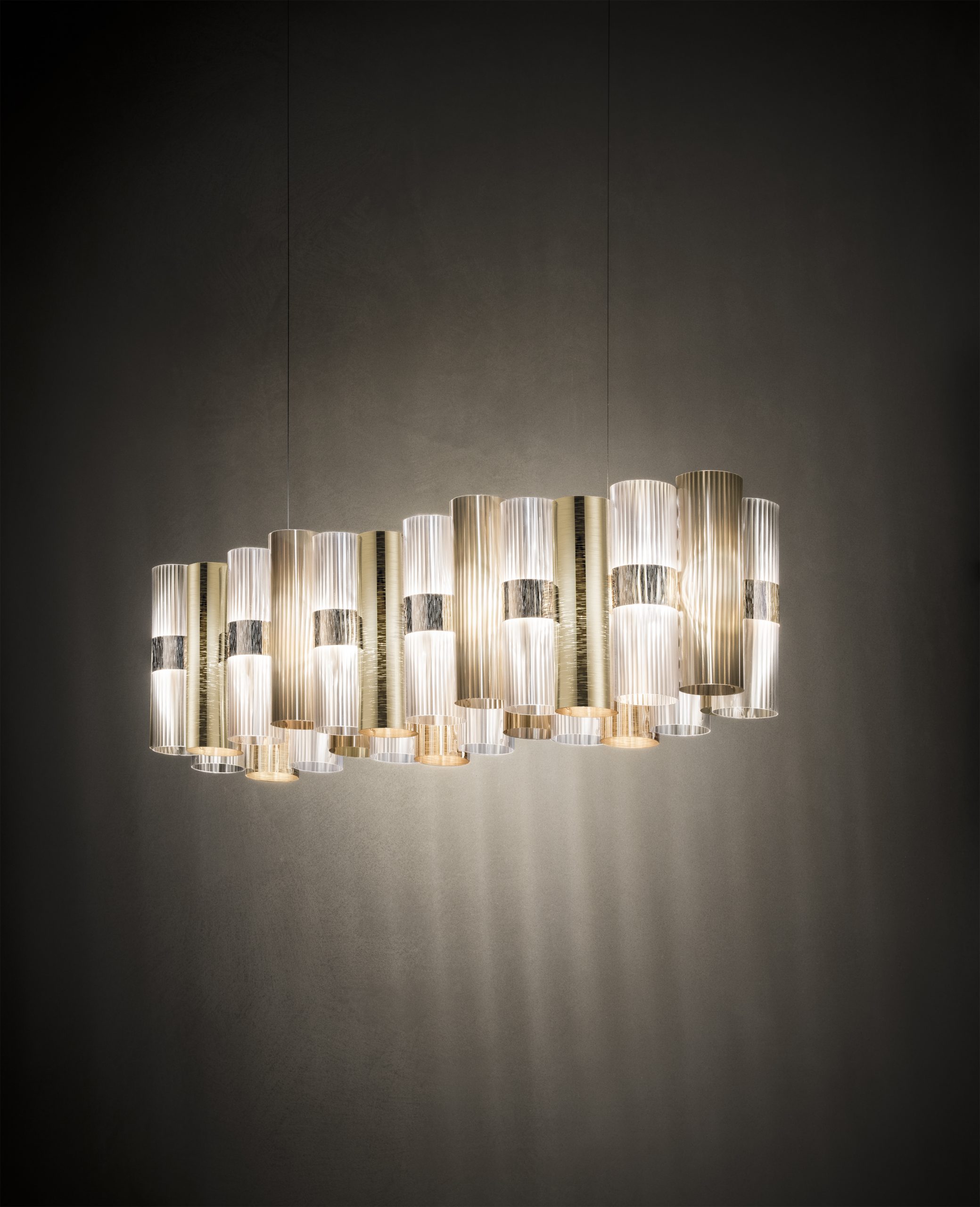 La Lollo is a tribute to the roaring 50’sand their retro charm. A series of unbreakable and lightweight technopolymer cylinders are disposed on a LED integrated central ring. Opulent and dramatic, the suspension’s colour and size can be customized by request to fit large scale installations.
