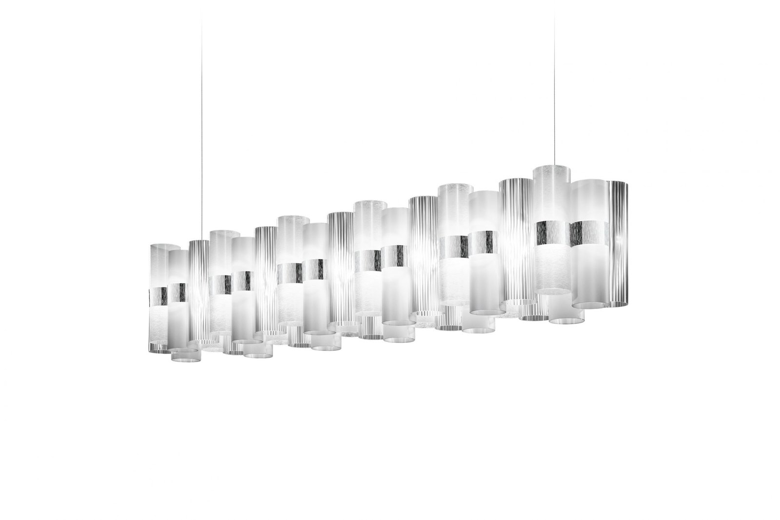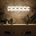 La Lollo is a tribute to the roaring 50’sand their retro charm. A series of unbreakable and lightweight technopolymer cylinders are disposed on a LED integrated central ring. Opulent and dramatic, the suspension’s colour and size can be customized by request to fit large scale installations.