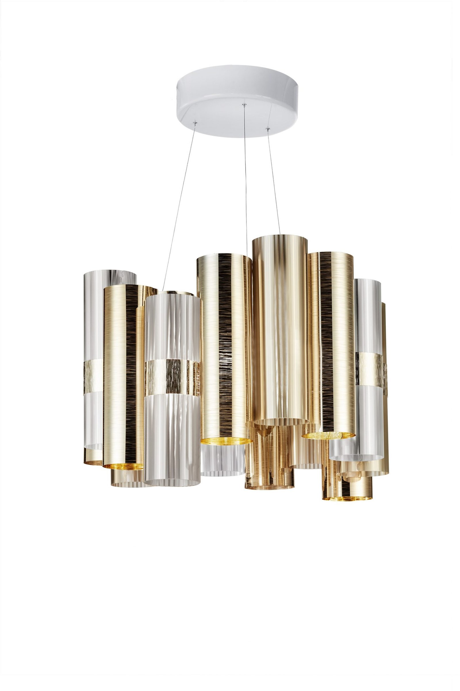 La Lollo is a tribute to the roaring 50’sand their retro charm. A series of unbreakable and lightweight technopolymer cylinders are disposed on a LED integrated central ring. Opulent and dramatic, the suspension’s colour and size can be customized by request to fit large scale installations.