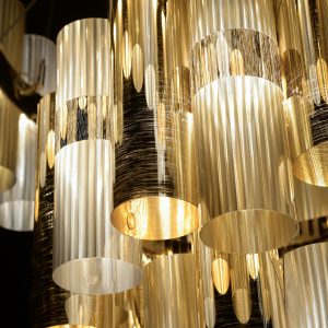 La Lollo is a tribute to the roaring 50’sand their retro charm. A series of unbreakable and lightweight technopolymer cylinders are disposed on a LED integrated central ring. Opulent and dramatic, the suspension’s colour and size can be customized by request to fit large scale installations.
