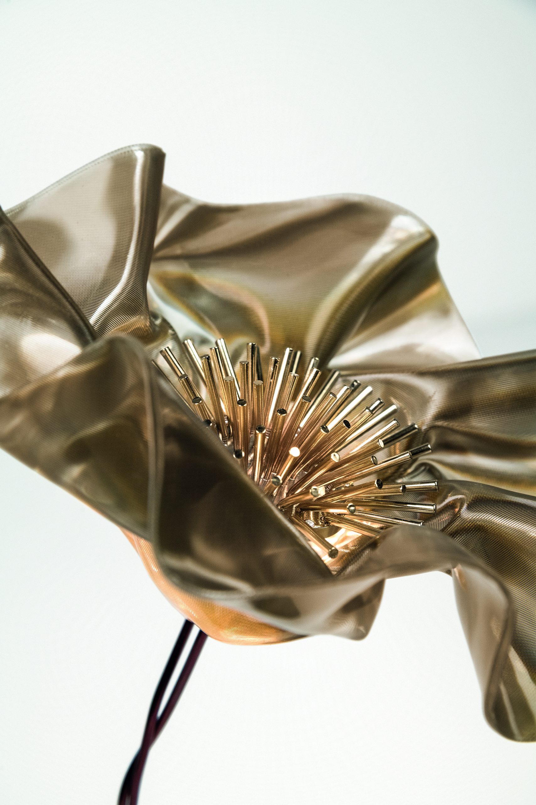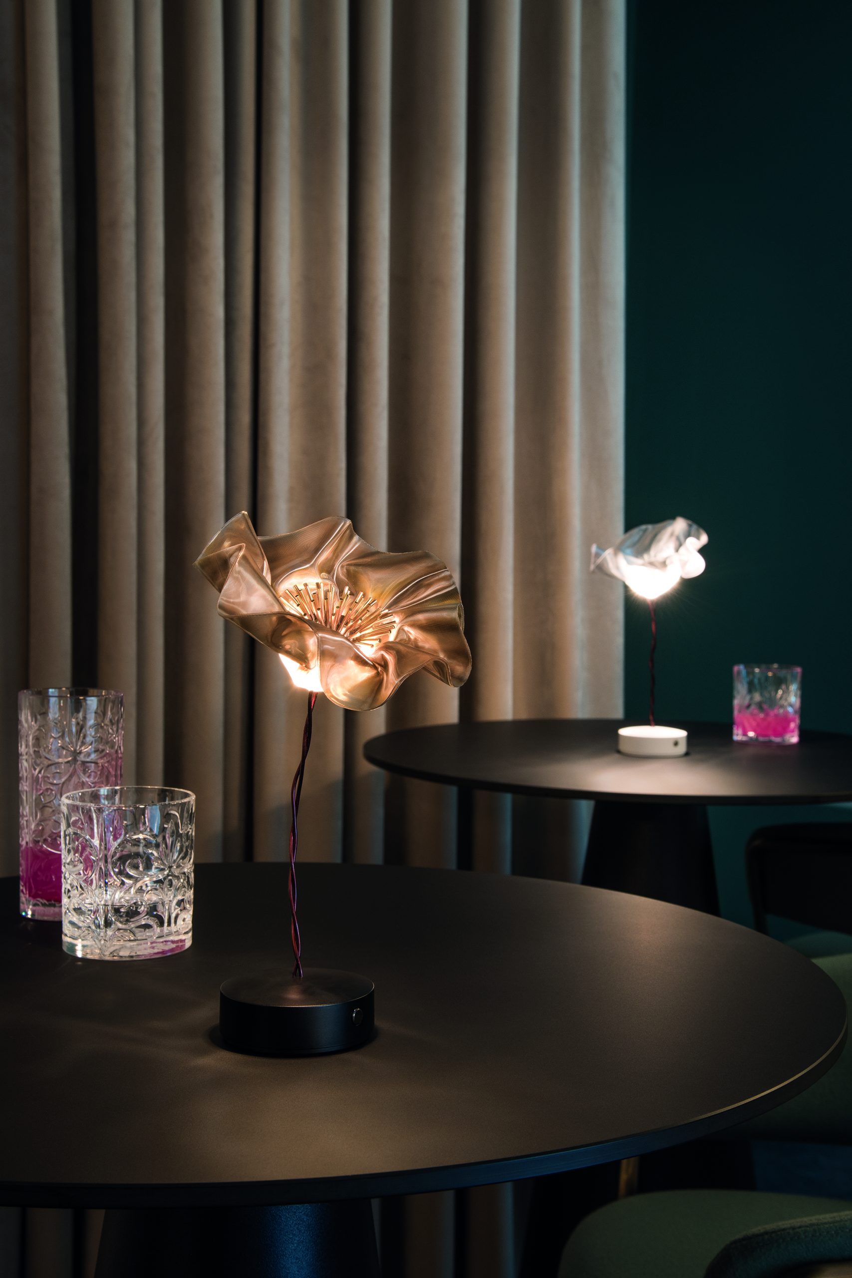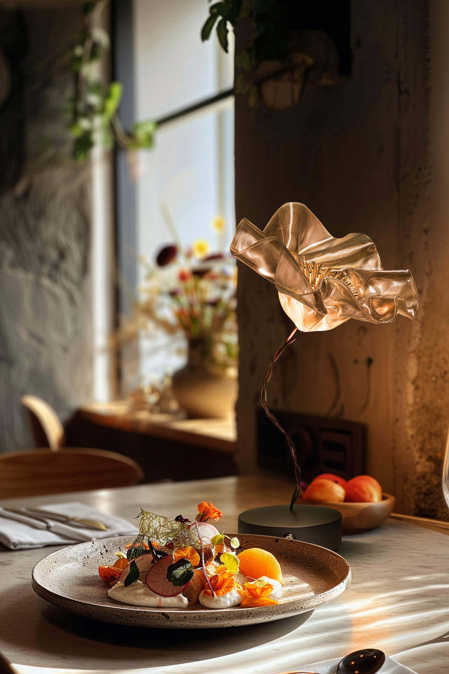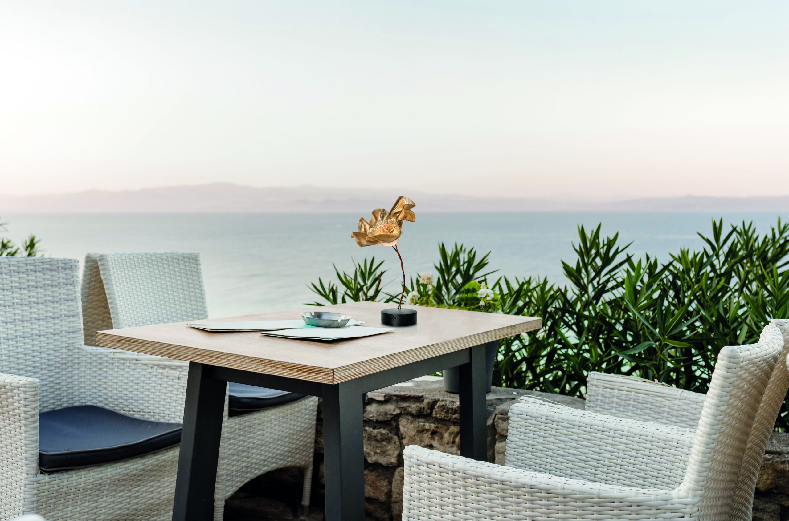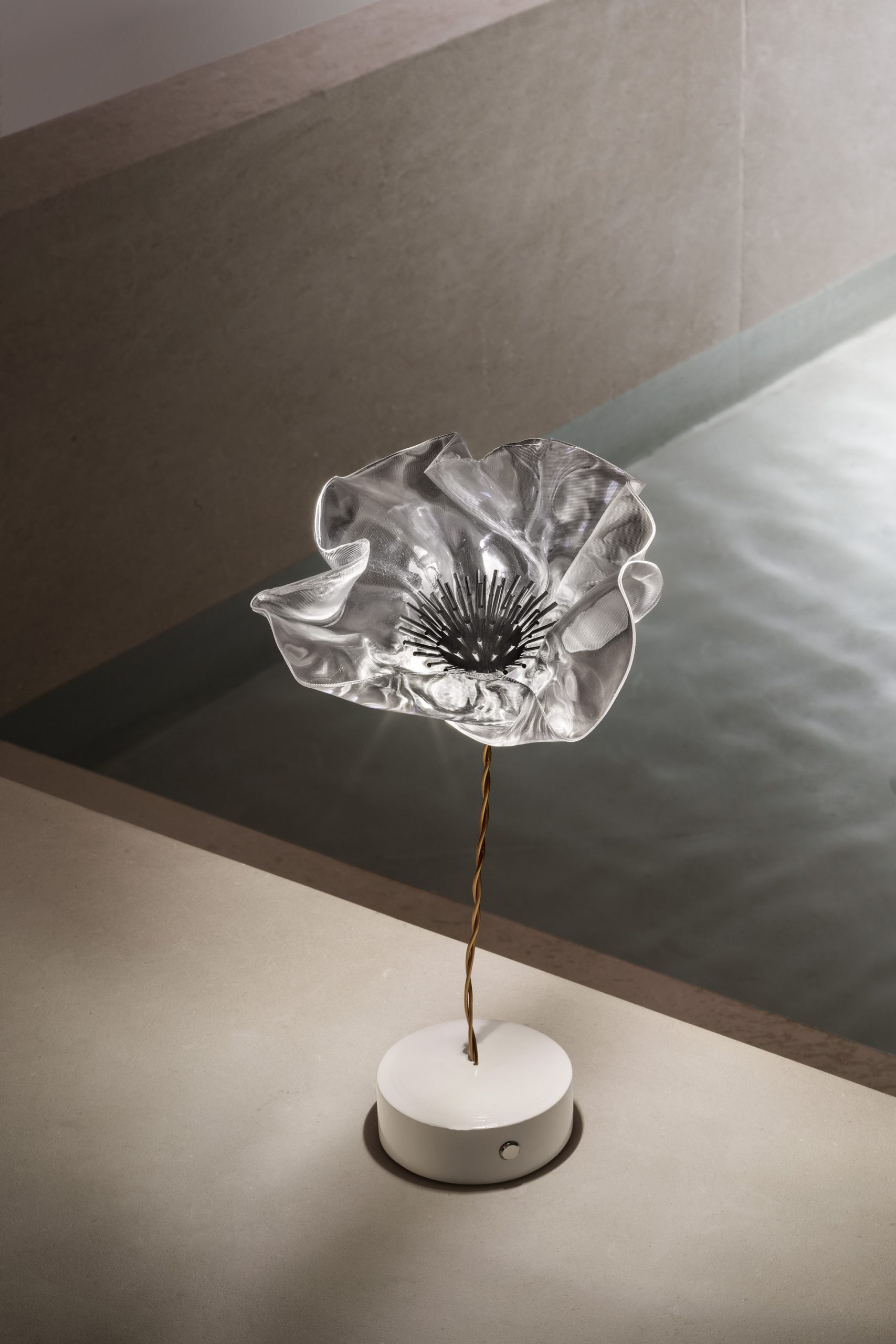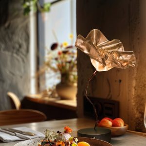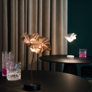 Marc Sadler pushed the boundaries of Slamp’s exclusive technopolymers, creating a new compositional language: the delicate, battery-powered LaFleur is a hand-molded bloom, slowly sculpted using temperature-controlled Lentiflex. Both the prisma and velvet versions have a matte magnetic base, in white or black, accompanied by a metal disc that firmly anchors the lamp under textiles for the perfect tablescape. The battery lasts up to 60 hours, and can be recharged using a multi-port station fit for HO.RE.CA. Also available as an applique.
