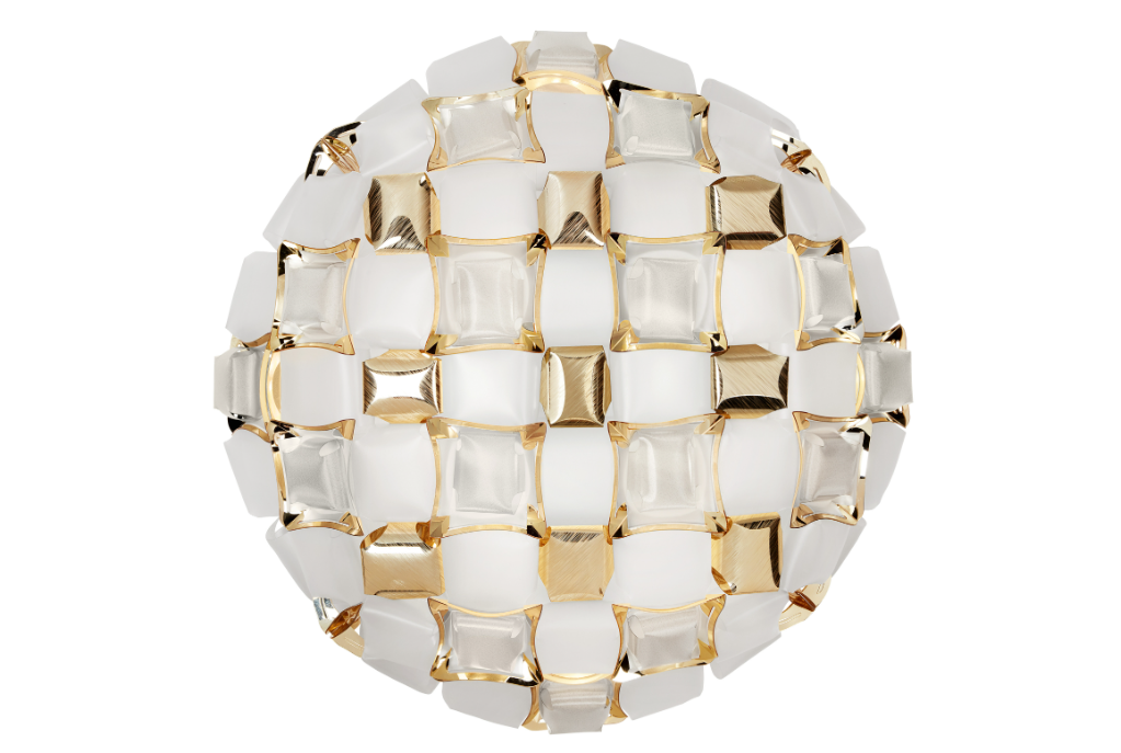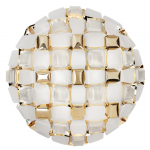 Mida is a ceiling/wall lamp with our exclusive magnetic system, inspired by the world of haute couture jewels. A pavè of precious gems encrust an almost invisible setting, and polished cabochon are geometrically scattered across a floral corolla with silky, iridescent stones. Available in five color combinations, from the flashy Multicolor, to the more versatile White/Platinum and White/Gold. Mida is fully handcrafted of white Opalflex® and printed Lentiflex®, whose silky morphing effect alternates with the brushed metallized “gems”. Mida makes any room extra-luxurious.