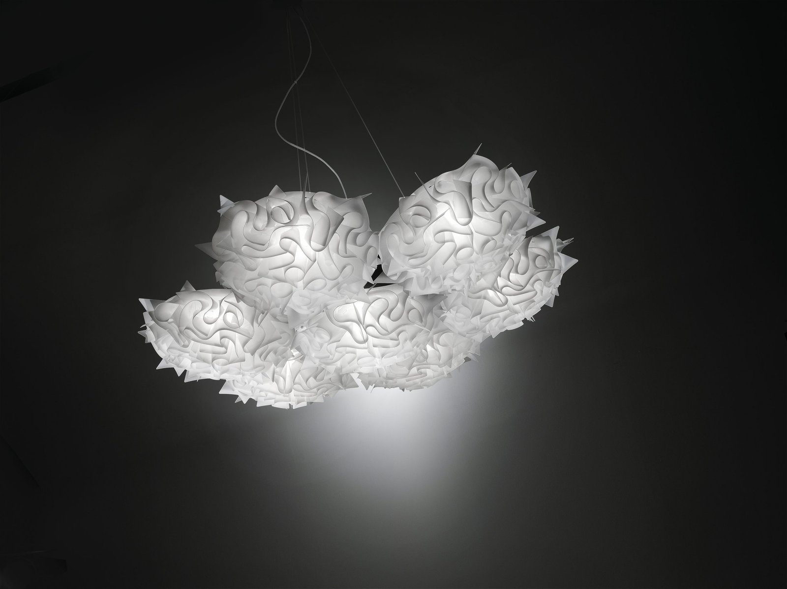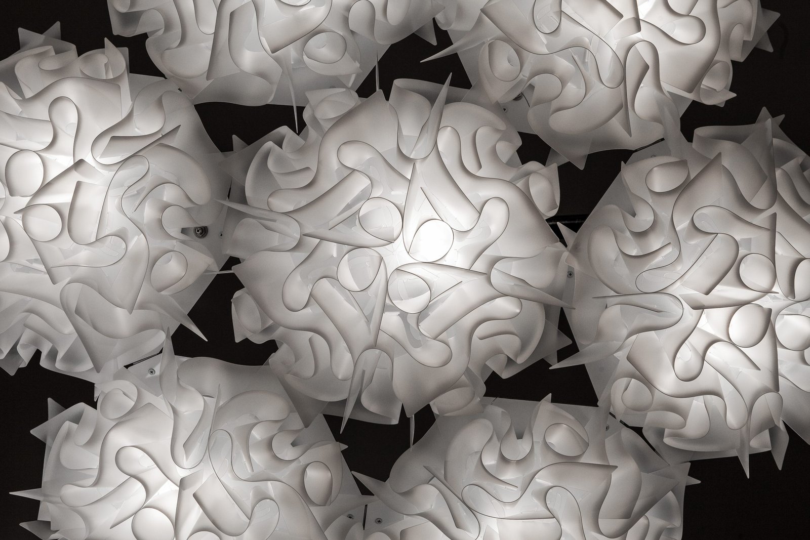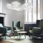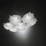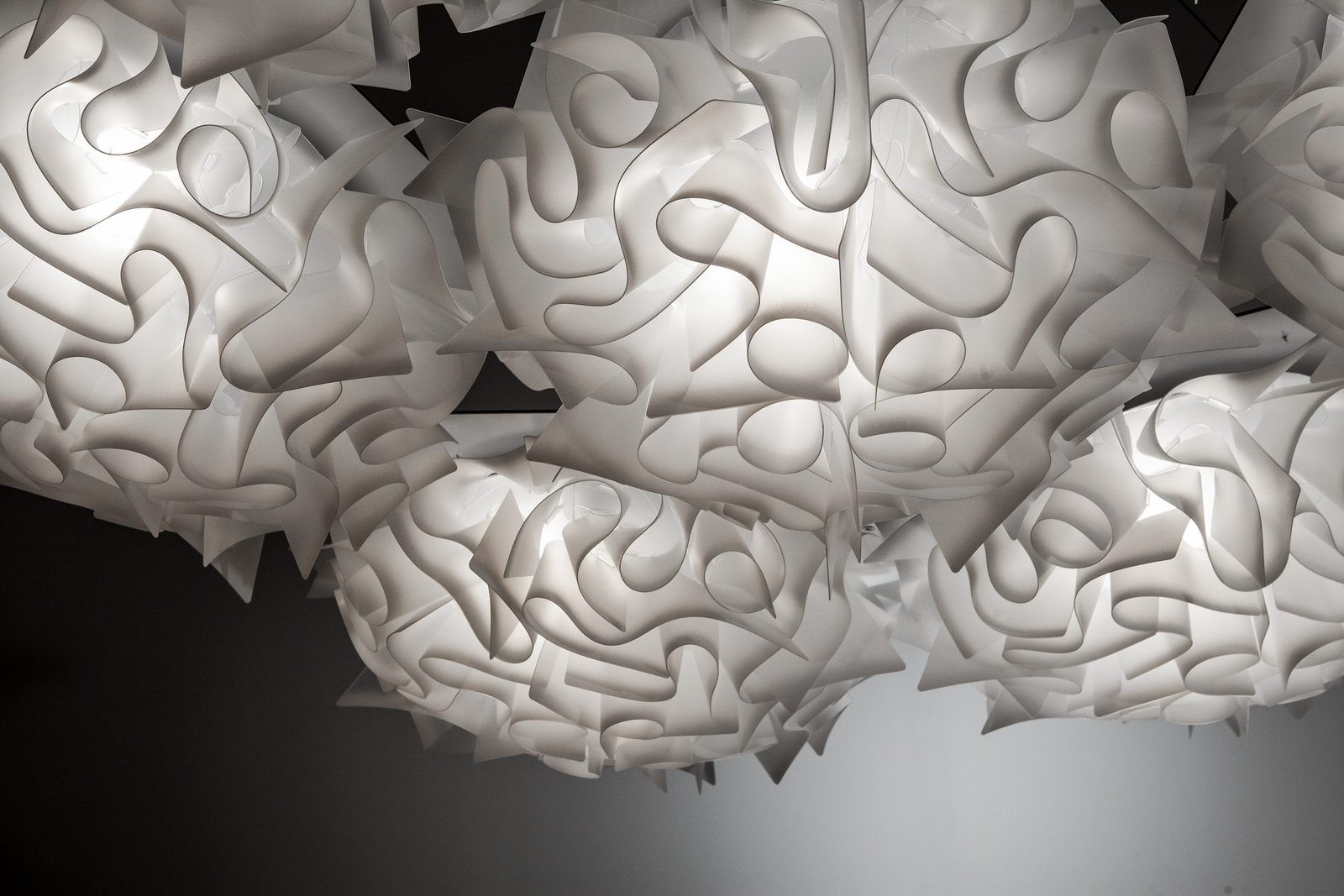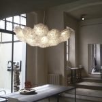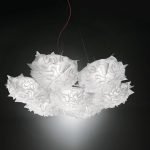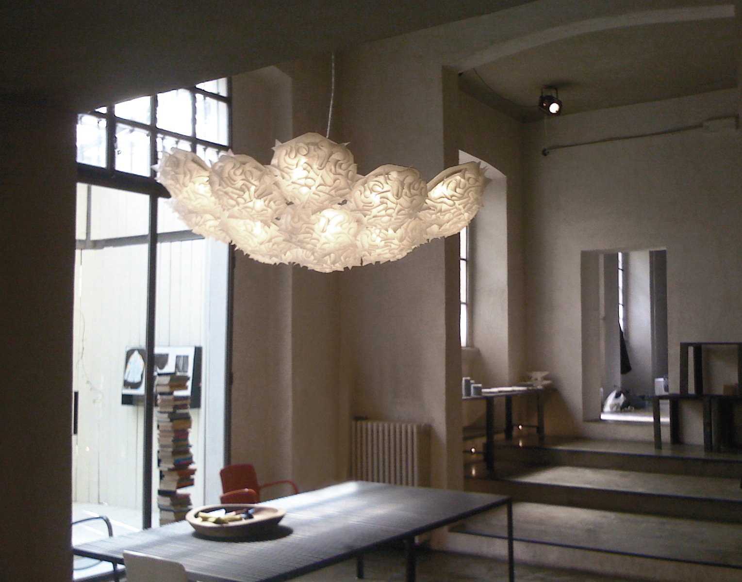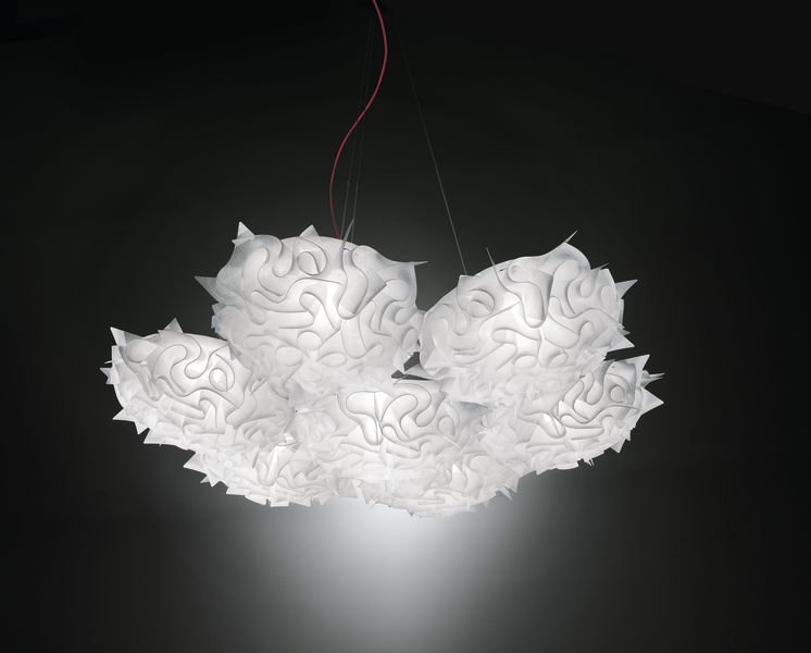 A soft finish that was inspired by modern fabric textures. Veli COPPER fills and envelops any space, setting it apart with its aesthetics and lush decorative characteristics. The suspension’s red, wrapped cable increases the handmade lamps’ modernity, taking a cue from the world of haute couture.