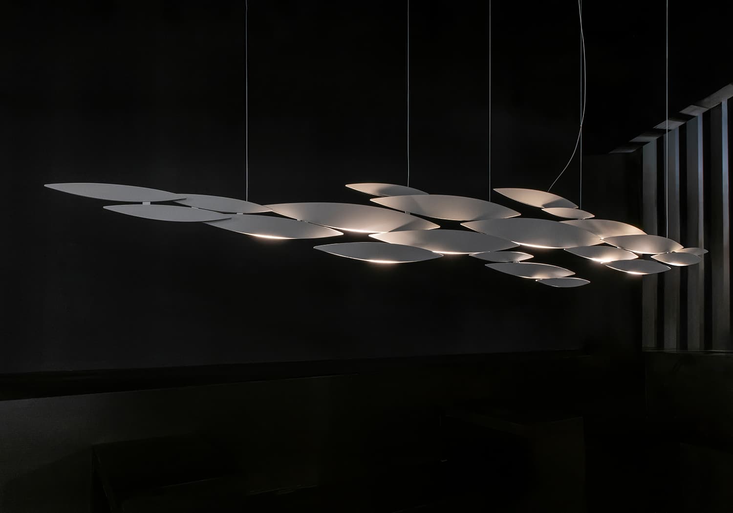 I Lucci Argentati draws from nature to create a whimsical, yet modern light. Sets of sleek elements combine to form a stunning pendant with thin incisions along the bottom creating an understated, tranquil beauty. Thanks to its modular system, I Lucci Argentati is customizable and can be combined in many different configurations: from small to extra large; as a pendant or sconce; and finished either in brushed nickel, brushed gold or white. Design Dodo Arslan. Made in Italy
