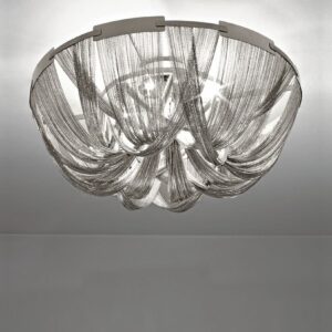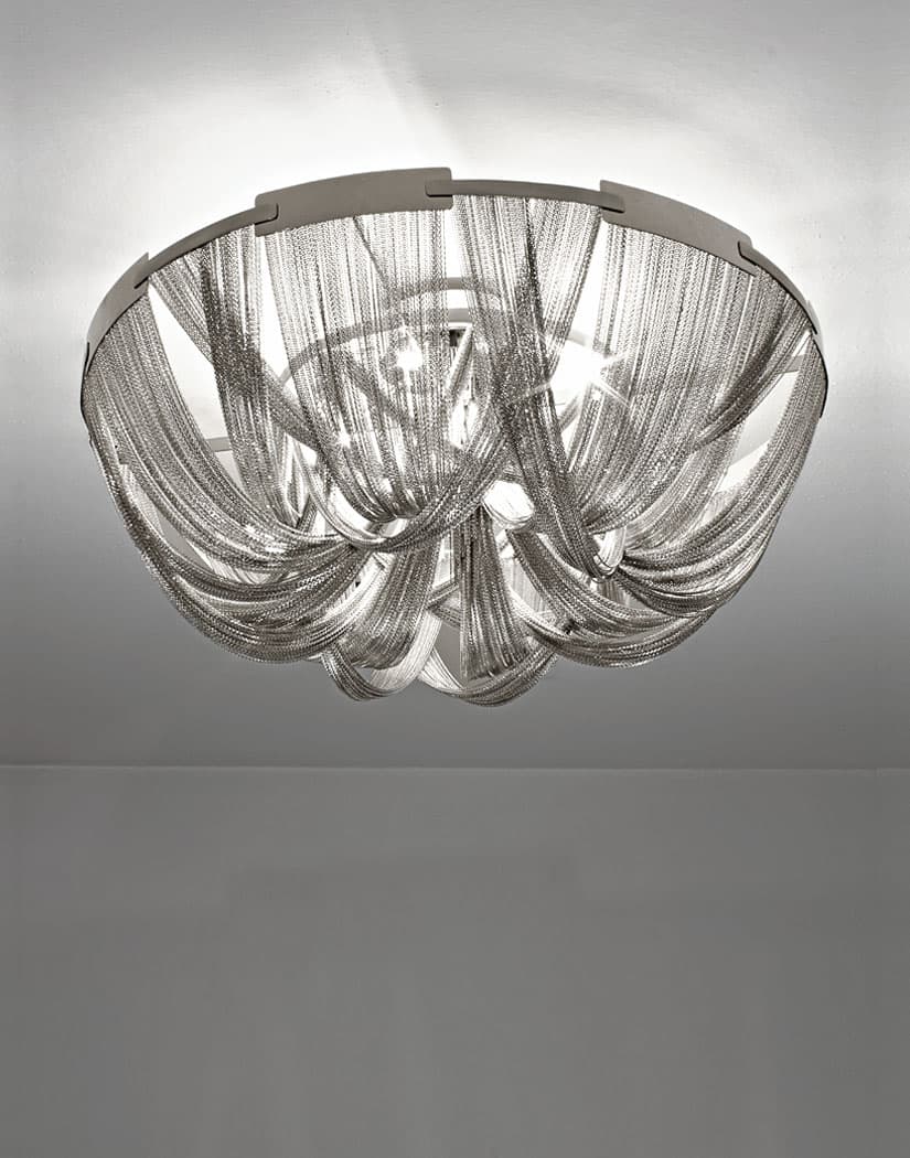 Reinventing the classics. With Soscik, Terzani combines traditional, artisan techniques with cutting edge technology to give the traditional chandelier a modern update. Created by interlacing metal chain over a nickel-plated frame, Soscik creates a dramatic and romantic effect, while still being able to compliment today’s modern luxury. Available as a chandelier or a ceiling lamp, soscik proves that modern design does not have to sacrifice luxury. Design Nicolas Terzani